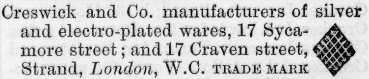 By 1862, only Favell was operating the firm. In that year, the plant, machinery, and 2,000 dies of Creswick & Co were auctioned (Sheffield Independent, 28 July 1862). However, Creswick & Co continued to trade under Charles Favell and his brother, Rupert. In 1863, they registered a silver mark from Sycamore Street. The firm’s later address was Arundel Street, where it employed 28 men, five women, and five boys in 1871; and 24 men and six women in 1881. The Favells dissolved their partnership in 1879, leaving Charles to continue until 1886. By then, Charles and Rupert had established their own firms (Charles Favell & Co, and R. Favell & Co).