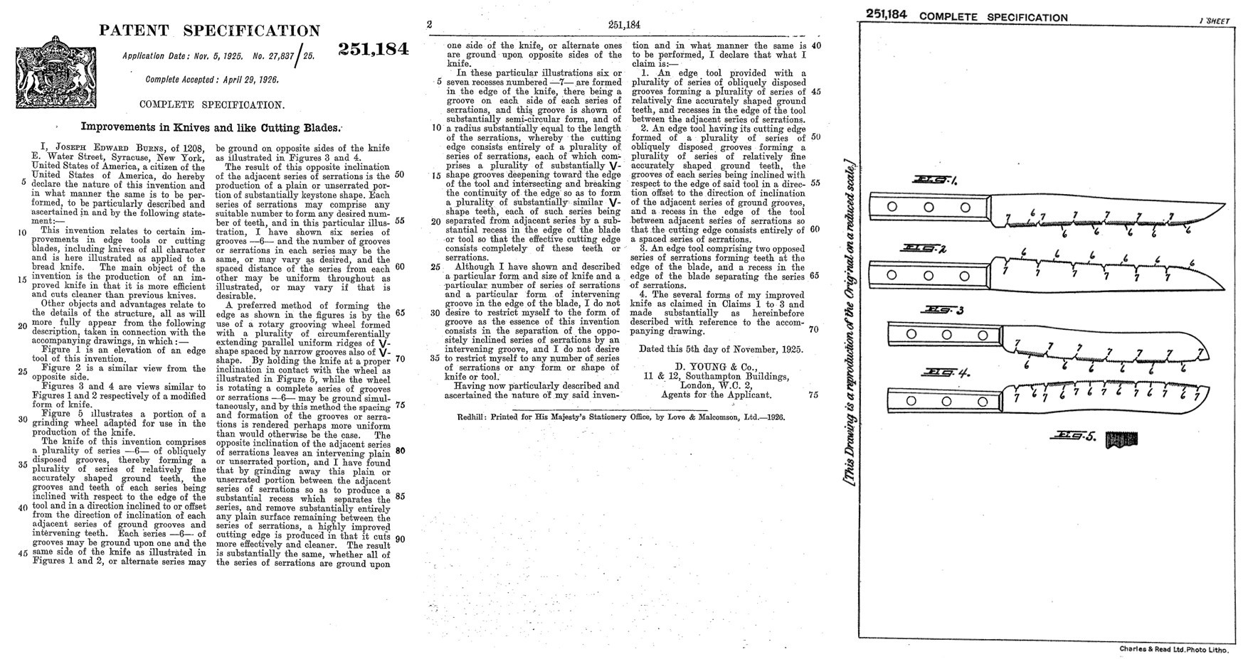 The ‘Burns’ double-edge saw knife had been designed by US inventor and entrepreneur, Joseph E. Burns from 1208 E Water Street, Syracuse, New York. He had a British Patent (251,184) approved on 29 April 1926 following his earlier approved US Patent (1,388,547) on 23 August 1923.