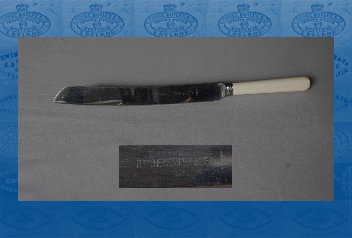 We believe that the knife we have was made for Fletchers, a famous Sheffield bakery and confectioners founded in 1895 by George Henry Fletcher. The company was well known for its advertising slogan of 'Better fetch a Fletchers Loaf' as well as the red and cream mobile delivery vans seen on the streets of the city during the period 1980 to 1999.