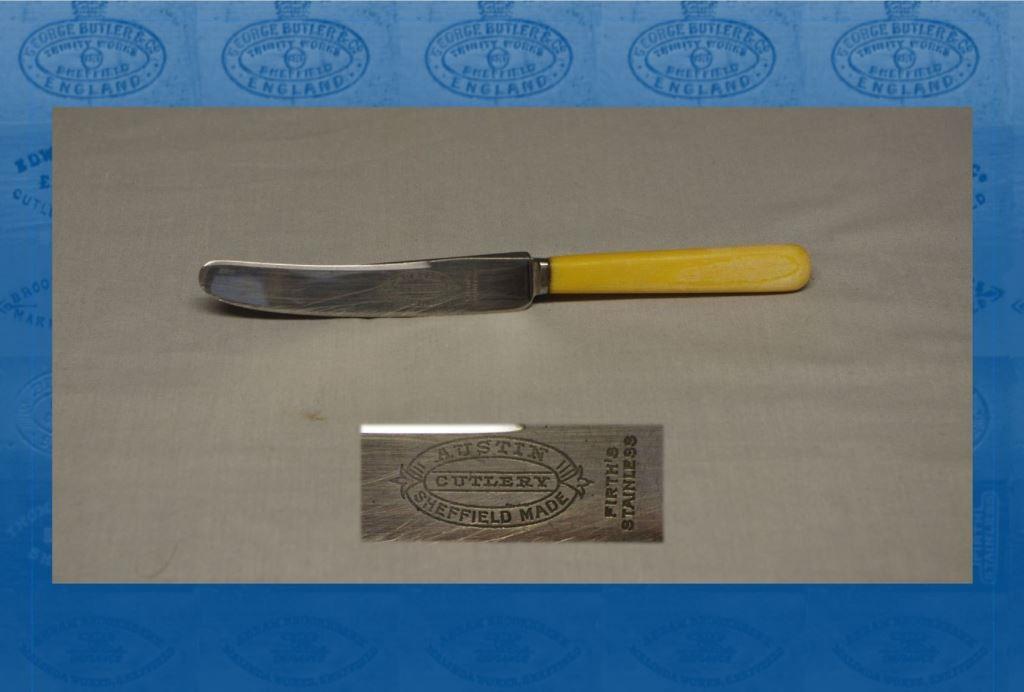 Stainless steel table cutlery was enthusiastically taken up by retailers around the UK, after its development during the First World War. This knife, made in Sheffield by an unknown maker, was probably retailed by W. Austin Balsom, a Reading jeweller. In 1919, Balsom had advertised ‘Austin’ stainless cutlery as the ‘Aristocrat’ of the table, which ‘entirely dispenses with knife cleaning in every shape and form’ (Reading Observer, 29 November 1919). William Austin Balsom (1869-1936) had been born at Jersey, the son of a builder. He came to Reading in 1890 and acquired experience in the local jewellery trade. In 1898, he married Ethel Maud nee Tyte (1875-1956), the daughter of a jeweller. In 1911, Balsom took over the jewellery shop at 14 King Street of Edwin S. Tanner (1841-1934) , who had become blind. Balsom built up the business (‘The Home of Value’) into ‘one of the best known in the jewellery trade in the county’ (Reading Standard, 19 June 1936). He celebrated his firm’s silver jubilee in March 1936, when he also acquired another jewellery shop. This was Charles Cotterell, Friar Street, which he placed under the charge of his son, Francis A. Balsom (1912-1967). However, Austin Balsom collapsed and died at his home, 10 Warwick Road, on 13 June 1936. A Methodist and a freemason, the funeral was at the Wesley Church in Queen’s Road, preceding cremation. He left an estate valued at £19,316.