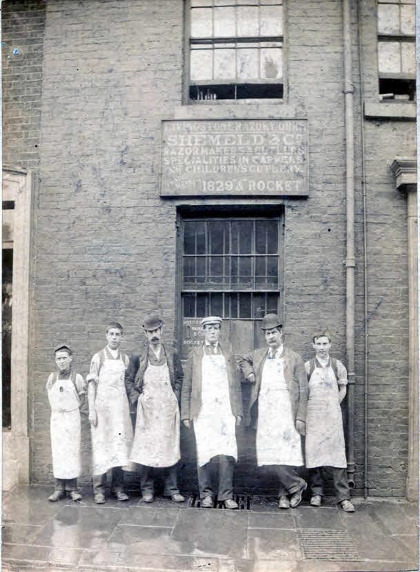 Thomas was using the name Shemeld & Co by the 1890s, when he was at Livingstone Razor Works, Carver Street. In 1891, he registered the ‘ECHO’ mark of James Barlow & Sons. A photograph of Livingstone Works, apparently taken in 1897, shows a group of six aproned men and boys. The sign above has ‘Shemeld & Co, Razor Makers and Cutlers, Specialities in Carvers and Children’s Cutlery’. In 1908, when Thomas was 77 (and his wife 70), he was awarded a pension by the Royal Metal Trades Pension Society, as a razor manufacturer, ‘now past work’ (Sheffield Independent, 30 January 1908). The Shemeld workshops moved to Aberdeen Works in Division Street (see Francis Howard). Thomas William Shemeld & Son became the ‘successor’ at Division Street. The ‘son’ was Harold Ward Shemeld (1889-1948). However,Thomas William died in 1914 (aged 57) and was buried on 21 May at Walkley cemetery.