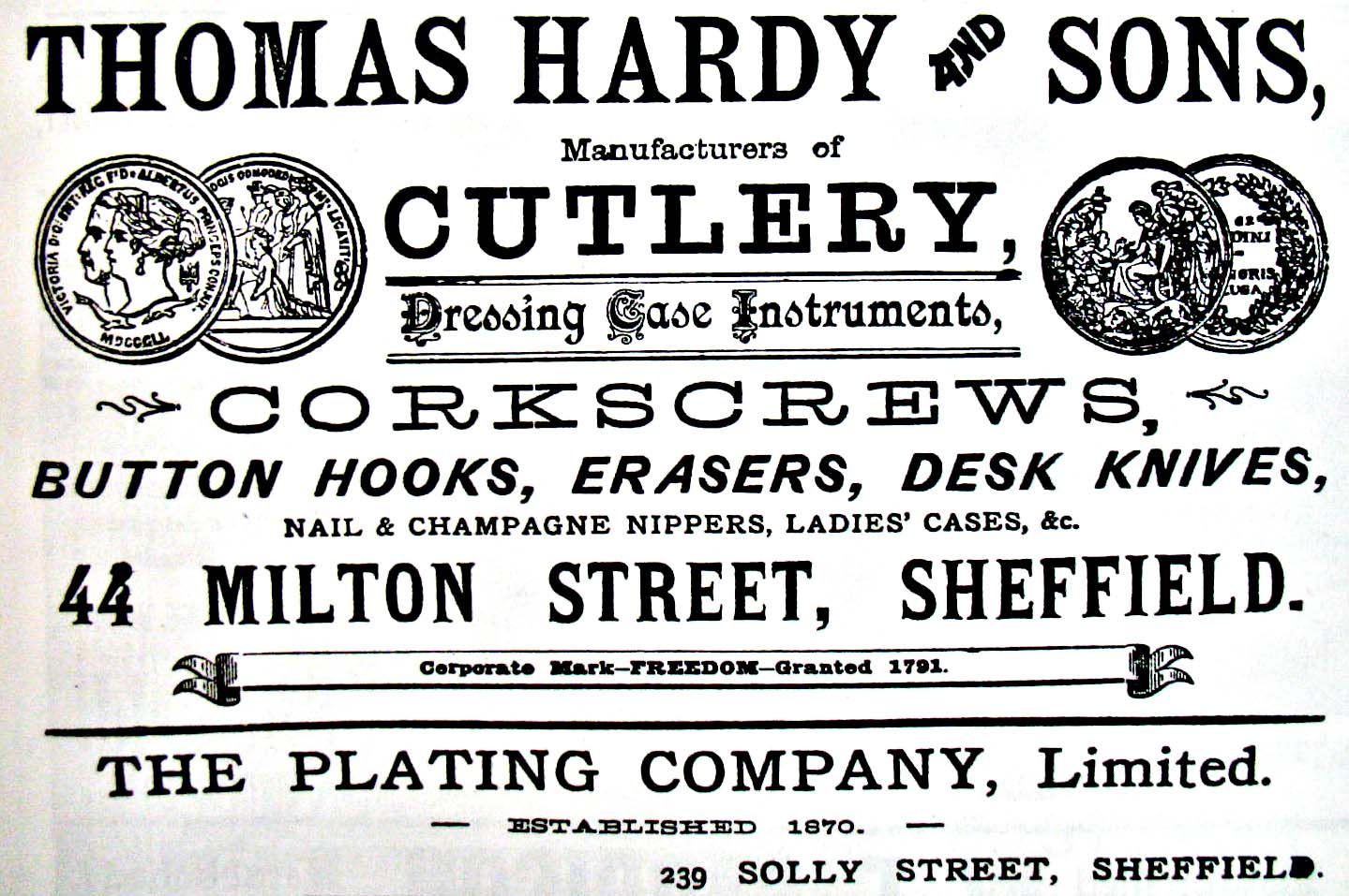Image courtesy of Geoff Tweedale Thomas Hardy (1822-1892) was the son of John Hardy and his wife, Mary. His brother was Robert E. Hardy. Thomas was listed in 1845 as a maker of pearl and polished steel articles, button hooks, and corkscrews in Sheffield Moor. By the mid-1850s, Thomas was at Milton Street. He advertised regularly in directories, offering cutlery, dressing case instruments, nail and champagne nippers, and nutcrackers. The firm won a Prize Medal for its dressing case instruments at the Great Exhibition (1851); and another award at the London International Exhibition (1862). Thomas employed about six workers. The trademark was ‘FREEDOM’ (granted in 1791). In 1871, the workforce was twenty men and five boys; and 22 men, eight boys, and eight girls a decade later. Thomas’s sons, John (1847-1891) and Thomas Jun. (1857-1892), became partners. However, Thomas himself, his wife (Eliza), and sons were dead within three years. Thomas Jun. died on 29 July 1890, aged 33, and was buried at Norton Cemetery. He left £628. His mother, Eliza, died at Harrogate on 18 September 1890. John died on 7 December 1891, leaving £1,515. His burial was at Ecclesall. Thomas Hardy, of Montgomery Road, died on 7 December 1892, aged 70, and was interred in a grave in the General Cemetery (with the remains of Eliza and brother Robert). Thomas left £9,763. The business continued under John’s sons, John Henry Hardy (1873-1955) and Thomas Arthur Hardy (1875-1973). During the 1930s, the address was Wessex Works, Milton Street. After the War, John Henry was the senior partner. A Freemason and Methodist, he died in Ecclesall on 26 January 1955, aged 81. He left £44,140. The next generation – John Hardy (1905-1985), who was John Henry’s son; and Thomas Norman Hardy (1903-1979), who was Thomas Arthur’s son – were partners. The company ceased trading in about 1963.