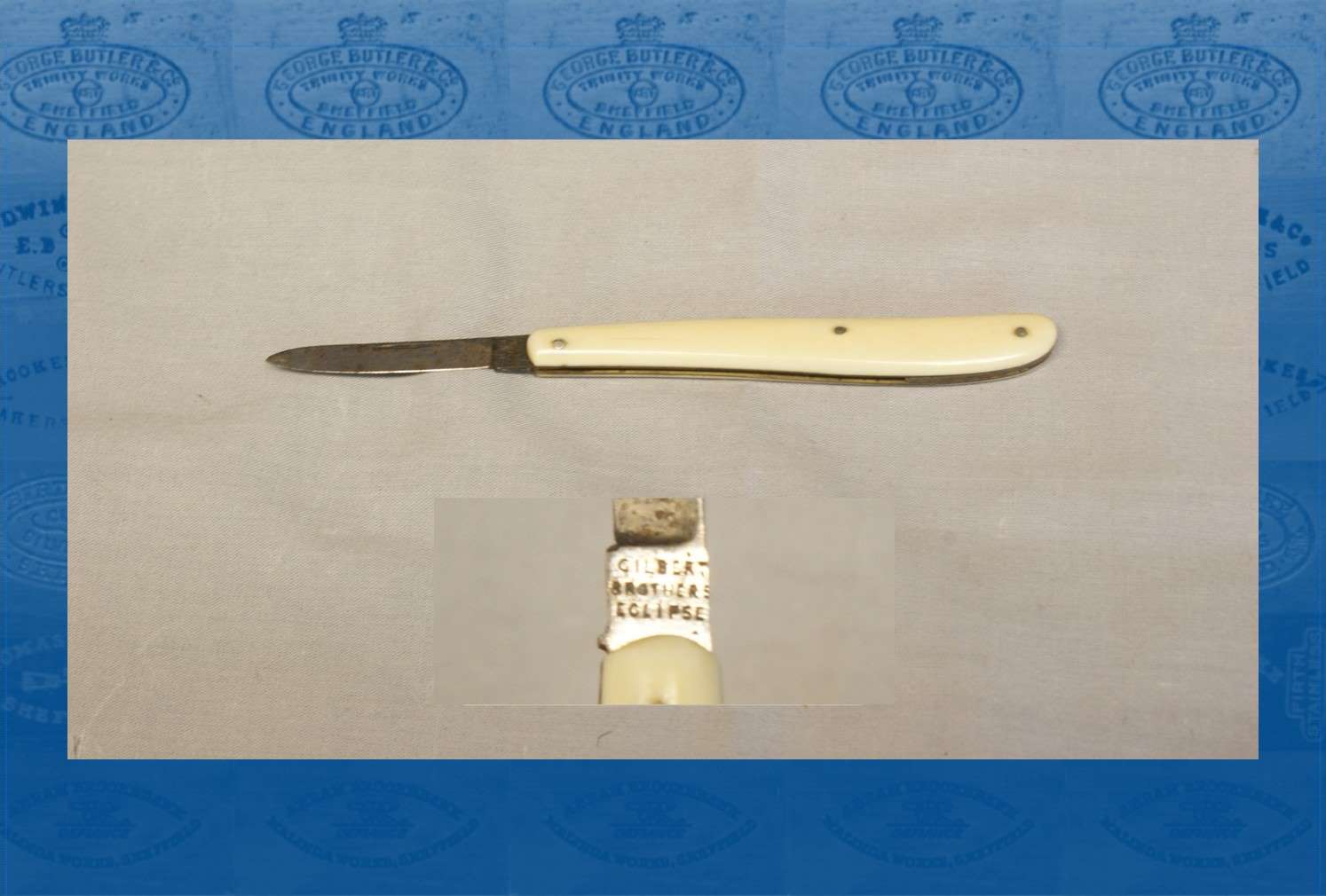 During the 1860s, William’s son, Frederick William Gilbert (1838-1887), joined the business. Other partners were recruited, but apparently had little success. William Pullan Salt (1838-1901), a clerk, joined the firm, but withdrew in 1864. John Augustine Parkes was partner until 1865. Frederick William’s attempt to run the firm with another partner (Thomas Chambers) ended in bankruptcy in 1866. In 1867, Gilbert Bros’ stock (valued at over £7,600) was offered for sale at Eclipse Works (Sheffield Independent, 2 January 1867). The company remained listed in Oxford Road (1868) and West Street (1871), while Frederick attempted to start new ventures. William Gilbert, ‘manufacturer and agent’, West Street, died on 23 July 1871, aged 60. Frederick’s later ventures – selling pictures on West Street and then dealing in provisions – ended in bankruptcy. He was described as a ‘manufacturer’, Glover Road, when he died on 5 March 1887, aged 48. He was buried in the family’s unconsecrated grave in the General Cemetery. In 1882, the ‘ECLIPSE’ mark was acquired by Reuben Clarke (see William Shirley). After 1909, ‘ECLIPSE’ was used by the steel and tool maker James Neill.
