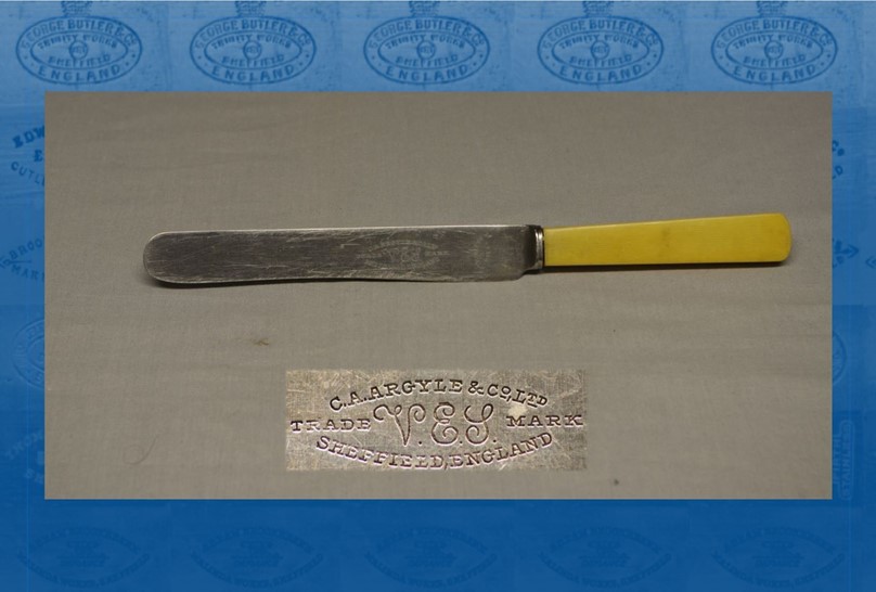 Charles Anthony Argyle (1859-1938) was born in Sheffield, the son of Joseph (a carter and later horse keeper at a brewery) and his wife Maria. He worked as a railway clerk and then commercial clerk. In 1883, at Queen Street Chapel he married Clara Emily, the eldest daughter of Fanshaw Dixon. Charles A. Argyle later began business as a farriers’, plumbers’, and putty knife manufacturer. In 1901, C. A. Argyle & Co’s address was Pool Works, Burgess Street. The directory (1905) suggests that Argyle had acquired W. Grady & Co. By 1911, Argyle was based in West Hill Lane (off Devonshire Street). Argyle’s traded into the 1920s, when it became a limited company at Argyle Cutlery Works, 156 Rockingham Lane. However, it was liquidated in 1935. Charles A. Argyle, 36 Thompson Road, died on 31 August 1938. He was aged 79 and left £356 to his spinster daughter Elsie. The firm continued to be listed in Rockingham Lane into the 1940s. It manufactured butchers’, bread, and cooks’ knives, besides stainless steel table cutlery. The trade mark was ‘VES’ (which was listed under ‘W. Grady & Co’ in Woodhead, 19911). In the 1950s, Argyle’s address was Perth Works, 60 Garden Street – the location of Petty.