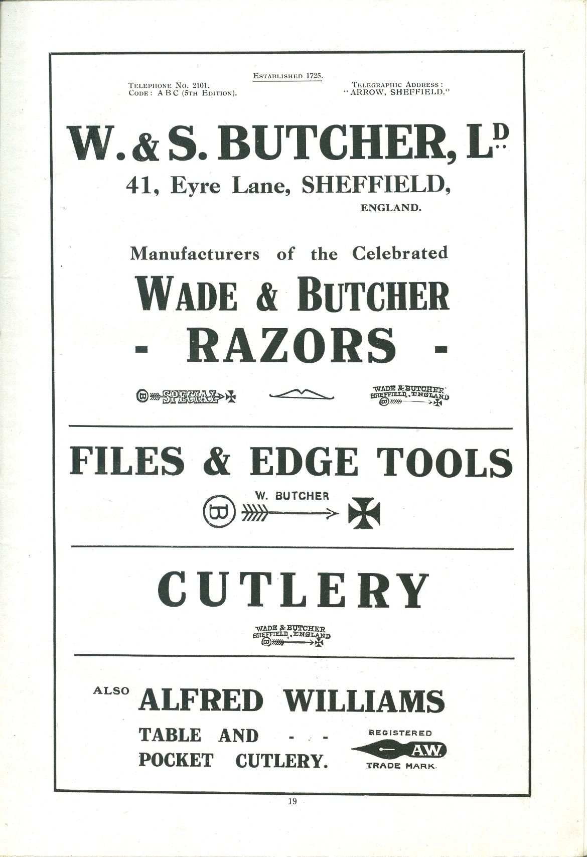 In 1913, one of Adolph’s brothers – Sigmund Kastor (1866-1947) – decided to buy the controlling interest in Butcher’s. Besides Sigmund, the partners included Charles Leslie Butcher (C. F. Butcher’s son, who had been born in 1877) and Alfred Williams. Sigmund probably intended to continue to ship razors from Sheffield to the USA, but this arrangement was inevitably disrupted by the War. In 1918, Sigmund sold the business. Butcher’s soon had another American suitor. This was the Durham-Duplex Razor Co Ltd, which was a New Jersey pioneer of safety razors – a product that would largely supersede hand-ground straight razors in the early twentieth century. The firm had been established by Thomas C. Durham and was later headed by Thomas C. Sheehan (1870-1938). In 1920, Sheehan visited Sheffield after Durham-Duplex had acquired shares in W. & S. Butcher. In the following year, the US firm registered Wade & Butcher Ltd as a new company in England, with £1,000 capital (and Wade & Butcher Corporation was registered in the USA, with capital of $1m). By the end of the decade, Durham-Duplex held the majority of Butcher’s stock and the old family interest waned. On 10 January 1924, Charles F. Butcher died at West Lodge, Claremont Place, Sheffield, leaving £125,950. Despite the takeover, W. & S. Butcher Ltd continued to be listed in directories as a cutlery manufacturer in Eyre Lane and 72 Arundel Street. ‘Alfred Williams’ was another stand-alone name in Eyre Lane.