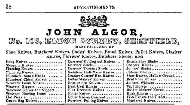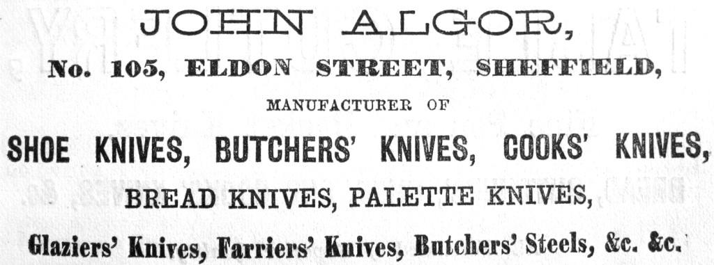Born in Thetford, Suffolk, in about 1802, Algor specialised in shoe, bread, butchers’, cooks’, glaziers’, farmers’, and artists’ palette knives. In 1837, he worked in Cross Burgess Street, but by 1841 had moved to 105 Eldon Street. In 1851, he employed fourteen men. Algor displayed his products at the League Bazaar in London (1845), the Great Exhibition (1851), where he received an Honourable Mention, and the Irish Industrial Exhibition (1853).