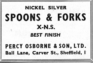 Percy Osborne began in the 1920s as a manufacturer of electro-plate cutlery, fish eaters, tea knives, children’s sets, jam spoons, butter and cake knives. The address was Ball Lane, Carver Street. Osborne was an exhibitor at the British Industries Fair (1929), where he offered the ‘cheapest price’. The firm became a private limited company in 1942 (capital £1,000), which specialised in silver fish eaters and carvers. In the late 1940s and early 1950s, the address remained Ball Lane. By the 1970s, the company was based at Westwick Works, Solly Street. Osborne Silversmiths Ltd, Solly Street, was the successor. Percy Osborne was probably the individual of that name, who was born in 1883 and later lived at Bingham Park Road. He died at Nether Edge Hospital on 30 August 1964, leaving £4,225.