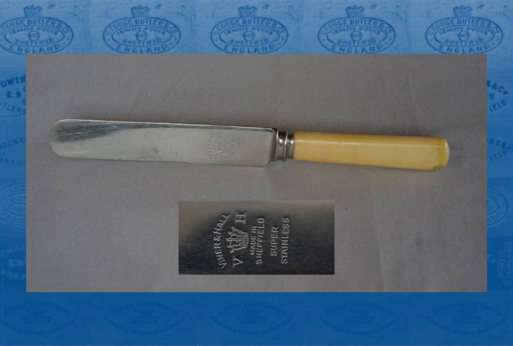 This firm was active between the 1920s and 1960s as a manufacturer of stainless and electro-plated table cutlery. Its speciality was canteens of cutlery, which often had fancy wooden cabinets. The principal of the enterprise was Charles Frederick Hall, who was born in about 1881. His early life is obscure, but information from ships’ passenger lists suggests that he acquired experience at Westwood Works, Witton, Birmingham. This was the factory of S. M. Emanuel & Co, a manufacturer of studs, buttons, and jewellery. Possibly, Hall was trained in electro-plating, as on one occasion in 1907 he described himself as a ‘cyanider’. In 1918, he was in Canterbury, Sydney, in Australia, where he married Ruby Frances Sanderson. In the following year, the couple returned to England. In 1921, when he sailed again for Australia, Hall was a ‘commercial traveller’ for Emanuel’s. By 1925, however, his surname had become Viner-Hall and his business address was Broomspring Works, Bath Street, Sheffield (the address of Viners Ltd). Why Hall changed his name is unclear: perhaps he had become Viners’ overseas manager; or maybe the double-barrelled name sounded more impressive. Certainly, some of Viner-Hall’s cutlery labels make clear that Viners Ltd was the manufacturer.