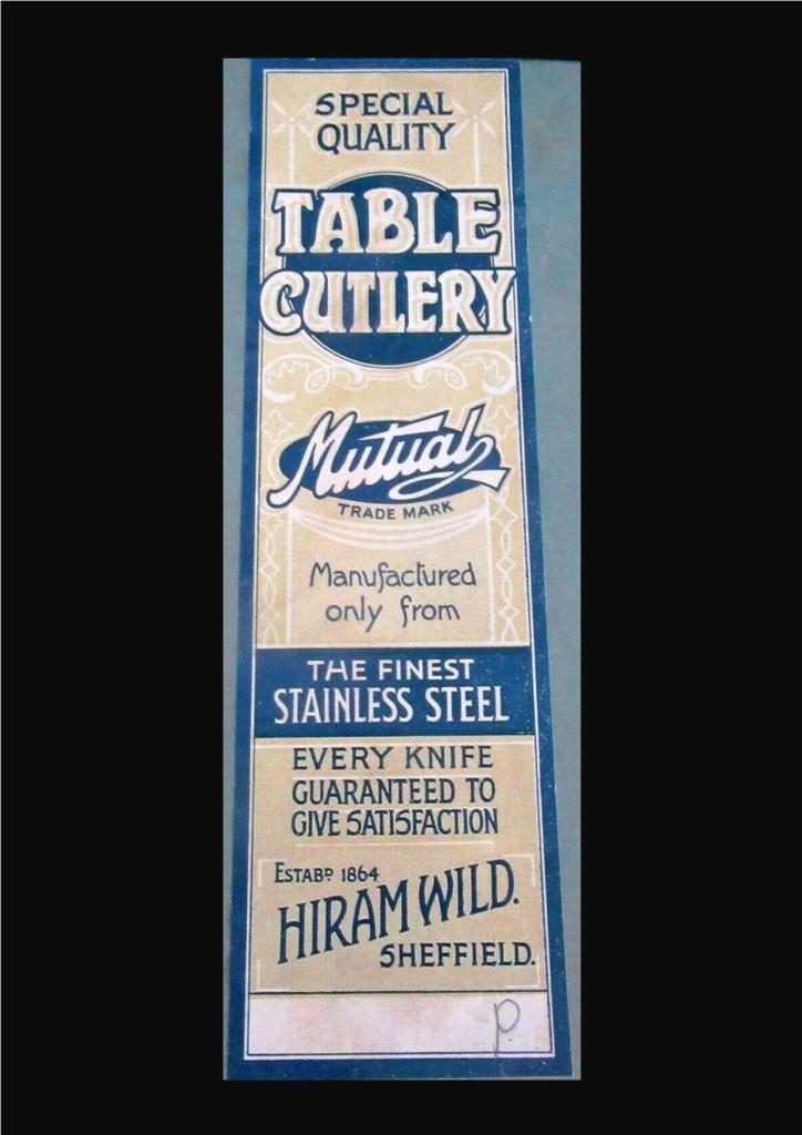 In 1879, Wild, who lived in Walkley, was listed alone as a table cutlery manufacturer at Cutts Works in Division Street. By the turn of the century, his enterprise operated in Rockingham Lane and Carver Street. By 1911, the works address was Central Cutlery Works, 62 Carver Street, with Hiram’s son, John Arthur Wild (1874-1936), running the business. Hiram Wild, South View Street, Cleethorpes, died on 2 March 1924, aged 81. He left £5,314. During the 1920s, Wild’s manufactured electro-plate and steel cutlery in Carver Street and Matilda Street. Its trade marks included the words ‘EQUAL’ and ‘MUTUAL’.