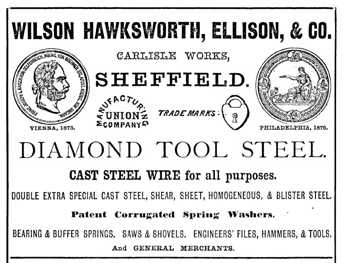 In 1846, Joseph Ellison (1797-1861) – who was the son of William, a file smith, and Sarah – was appointed American representative (the firm becoming Wilson, Hawksworth, Ellison & Co). Moss left to establish in 1853 the steel and file company Moss & Gamble Bros. He died on 6 September 1879, aged 79, at his residence in Broomgrove Road. A Wesleyan Methodist, he was buried in the General Cemetery and left an estate under £45,000 (Sheffield Independent, 8 September 1879). Wilson died in 1849. In the 1850s, the firm built a new steelworks, Carlise Works, in the Don Valley. One of the partners was Henry H. Taylor. In 1861, the firm employed 115 workers.