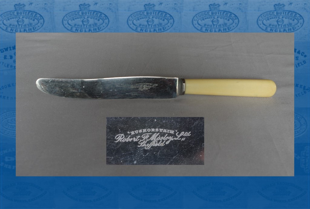 The stainless breakthrough came late in R. F. Mosley’s life. He remained chairman after the war, but died in Sheffield on 13 January 1921, aged 79. About 400 were said to have attended his funeral at Fulwood, including many long-serving workers and Alexander Clark. He left a large estate of £52,966. After his death, the firm should have done well, despite the end of the Edwardian silver boom and the subsequent waning of the Clark connection. Mosley’s advertised as the ‘first maker’ of stainless cutlery. In 1924, Mosley’s registered ‘RUSNORSTAIN’ as a trade mark in Sheffield (Doncaster, 19905). In that year, the mark ‘RFM’ (in a rectangle) was registered in Canada. Mosley’s opened a London showroom at Bath House, Holborn Viaduct, where it advertised cased sets of ‘RUSNORSTAIN’. The canteens were branded as the ‘original stainless cutlery’. Mosley’s also supplied Albert Cowley Bloxham (1868-1933), a London silversmith, whose table knives were marked ‘DIPLOMAT’ (Bloxham’s mark) and ‘RUSNORSTAIN’.