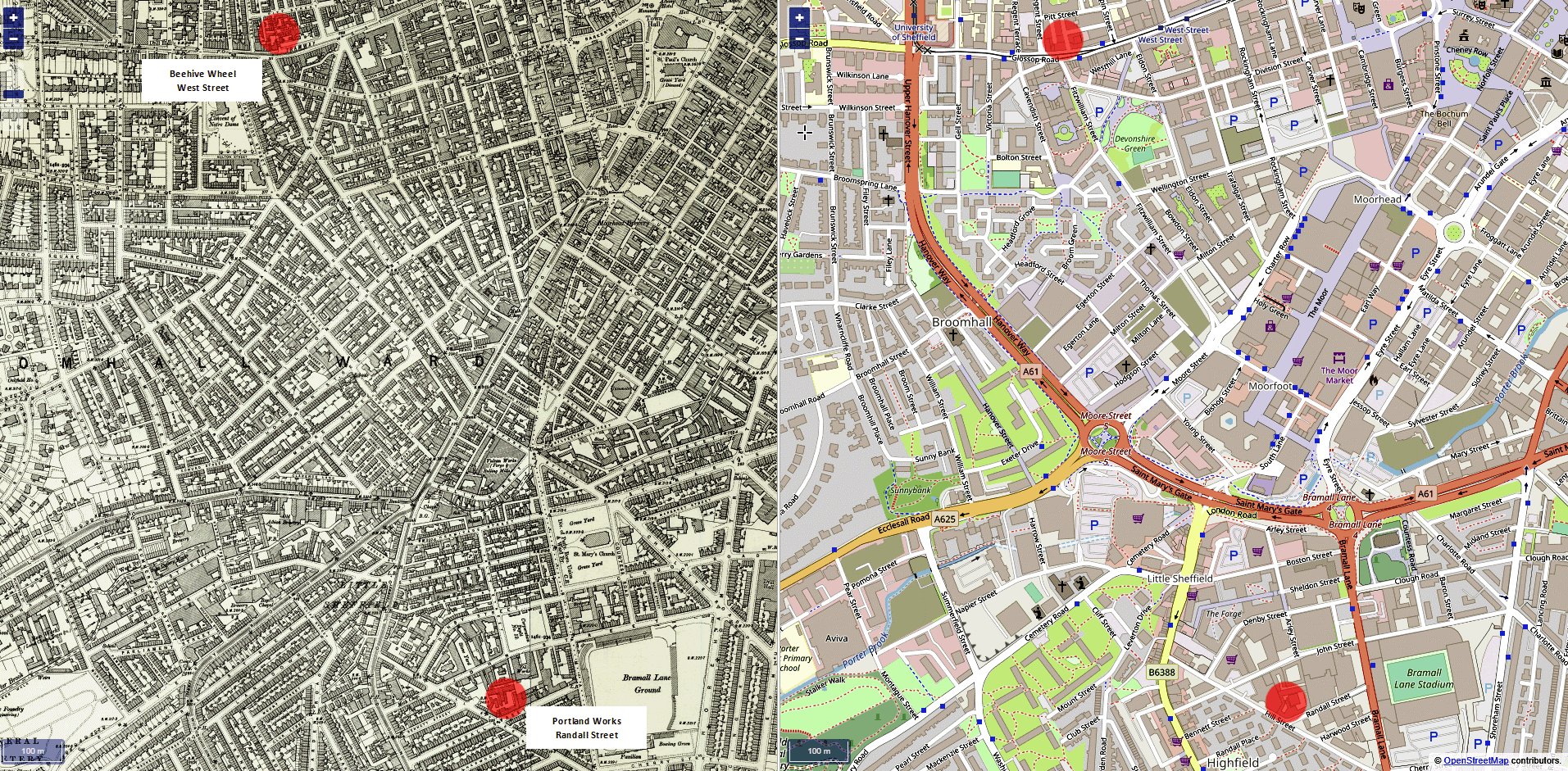 Until 1873, Mosley’s partner was Henry Lawton (1835-1885), who was a local grocer. Henry’s brother, George (1824-1892), became a table-knife manager at Mosley’s; George’s sons, Arthur (1855-1943) and Samuel (1867-1950), also became managers. By 1874, Mosley was sufficiently wealthy to buy Croft House in Lyndhurst Road, Brincliffe. Three years later, Mosley moved from West Street to Randall Street (Sheffield Daily Telegraph, 1 May 1877). (This is off Bramall Lane, where Sheffield United football stadium is now located.) Mosley’s newly-built Randall Street factory – on the corner with Hill Street – covered about ¾ acres on the usual plan: two and three stories of offices and workshops around a central courtyard. Although some workshops were rented to other tenants (for example, Mammatt & Sons), Mosley was the main manufacturer in the building, which he named Portland Works.