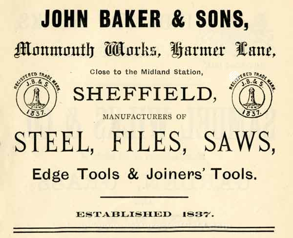 © SCC Picture Sheffield [y11980] - Advertisement c1889 for John Baker & Sons, manufacturers of steel, files, saws, edge and joiners' tools, Monmouth Works, Harmer Lane