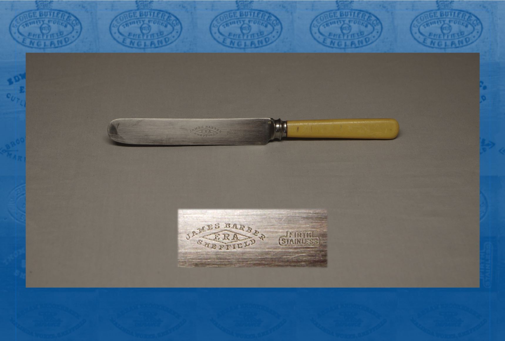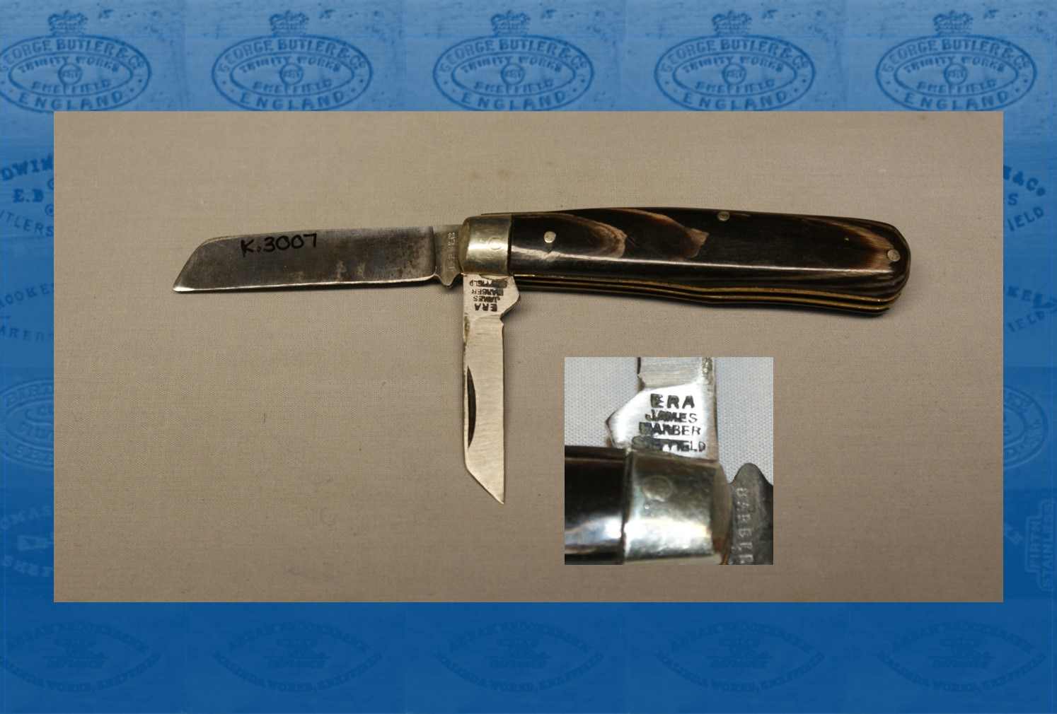 This pen knife, razor, and table knife manufacturer touted an establishment date of 1802. The founder was Isaac Barber (1788-1854), who had been born in Kimberworth. He was the son of Micah Barber (a Kimberworth collier) and his wife, Barbara, and was baptised on 23 April 1788 at Masbrough Independent Chapel, Rotherham. In 1802, Isaac was apprenticed to Kimberworth knife maker Samuel Skinner and became a Freeman in 1811. He married Mary Skinner (1785-1860), the daughter of his former master, and by 1822 Skinner & Barber had been formed as a pen knife and razor manufacturer at Edward Street. It was dissolved in 1833. In 1841, Isaac was living in Devonshire Street with his wife Mary and their son, James (1818-1859). By 1845, Isaac and James Barber were making spring knives in Broad Lane. By the 1850s, the firm’s trade mark was ‘ERA’ (possibly in use since 1835). The words and mark ‘JAMES BARBER’ were also used, particularly on razors.