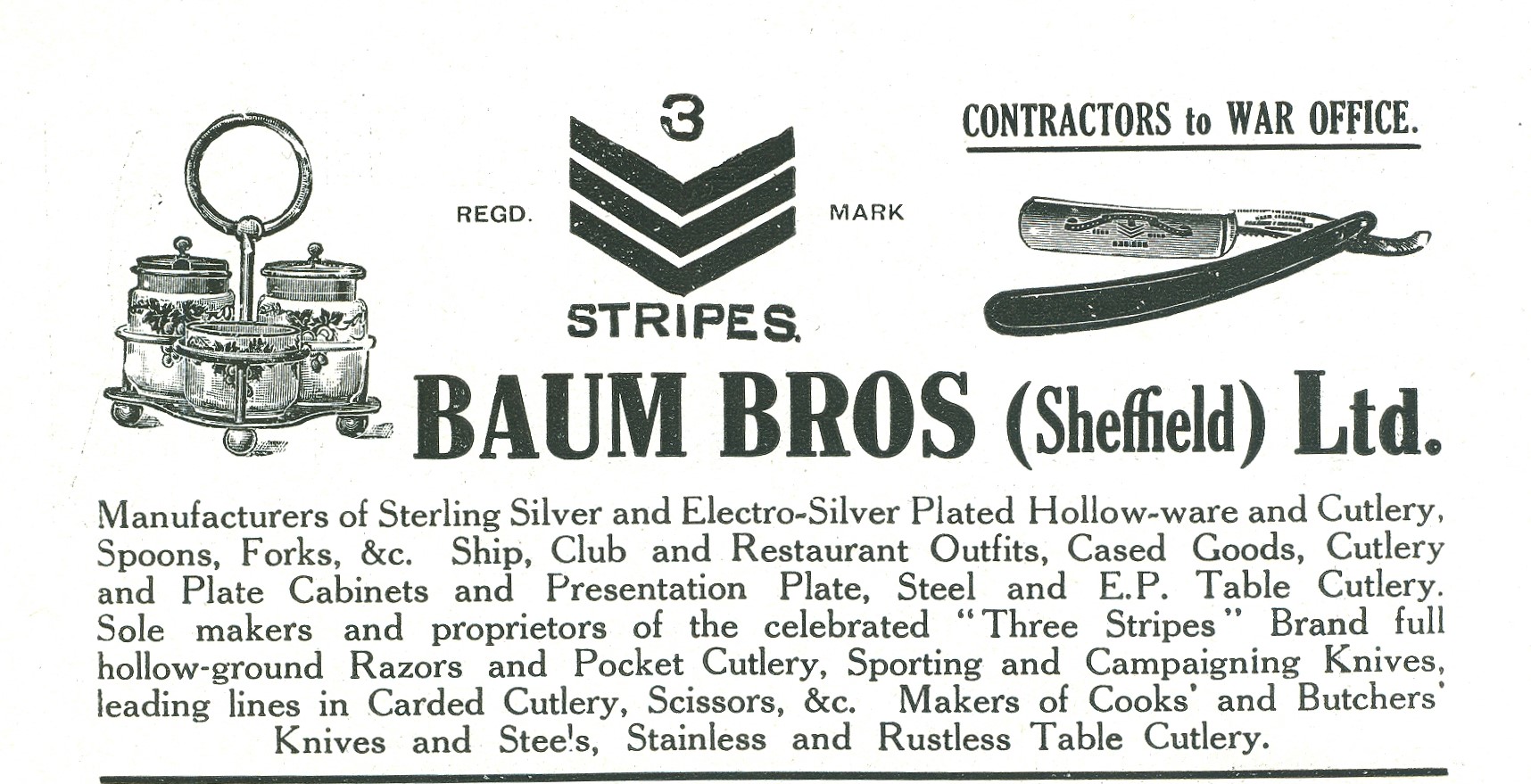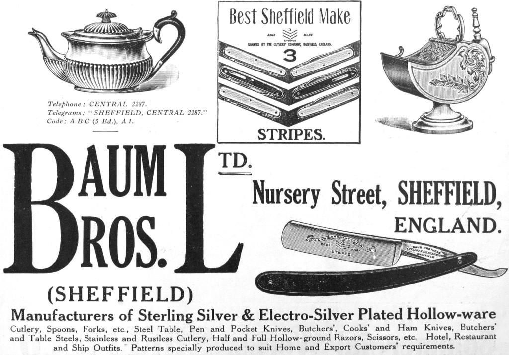 In 1872, Maurice Baum opened for business in Sheffield as a dealer in jewellery and fancy goods (including cutlery) in Pinstone Street. In the following year, he married Rachel R. Gluck (1854-1913), at the Synagogue, New Church Street, Sheffield. Their sons, Louis (1875-1955) and David (1876-1951), were born at No. 32 Pinstone Street. By 1880, Baum was based at Albert Works, a four-storied building in Norfolk Street. A silversmith (registering silver marks in 1884 and 1893), Baum produced plated goods, such as butter knives, desserts, and fish carvers. In the 1880s and 1890s , the company traded in table cutlery, and especially in electro-plate and meat carvers mounted in silver. It also introduced a white metal, ‘SILVERINE’. About 130 hands were said to be employed at Albert Works in the early 1890s. The firm also had an agency at Hatton Garden, London (The Century’s Progress, 1893).