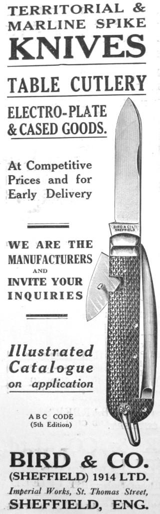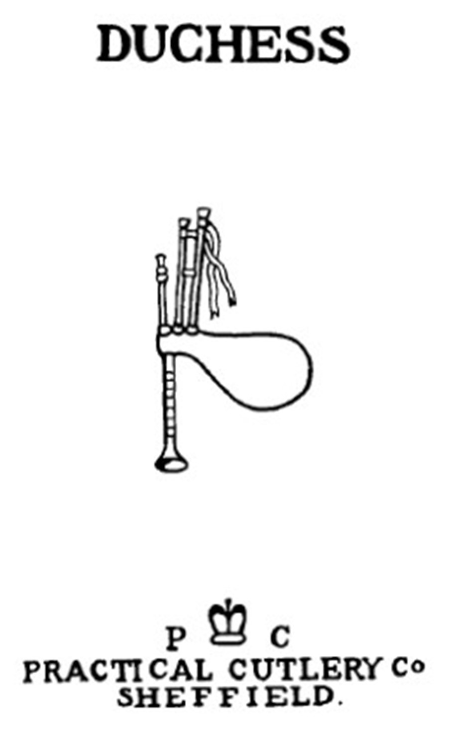 In 1914, Bird & Co (Sheffield) 1914 was registered with £2,000 capital, after Ryalls, Turner & Co bought Bird’s firm for £2,400 cash. Debentures of £2,500 were then issued. Also acquired was Bird’s bagpipes trade mark. Edward Bird died in Bombay on 21 November 1916, leaving £2,200. The name ‘Practical Cutlery Co’ was briefly resurrected in 1919 as an edge tool manufacturer in Broad Lane. ‘DUCHESS’ was used by Mottershaw & Rowe; the bagpipes mark later passed to George Wood.
