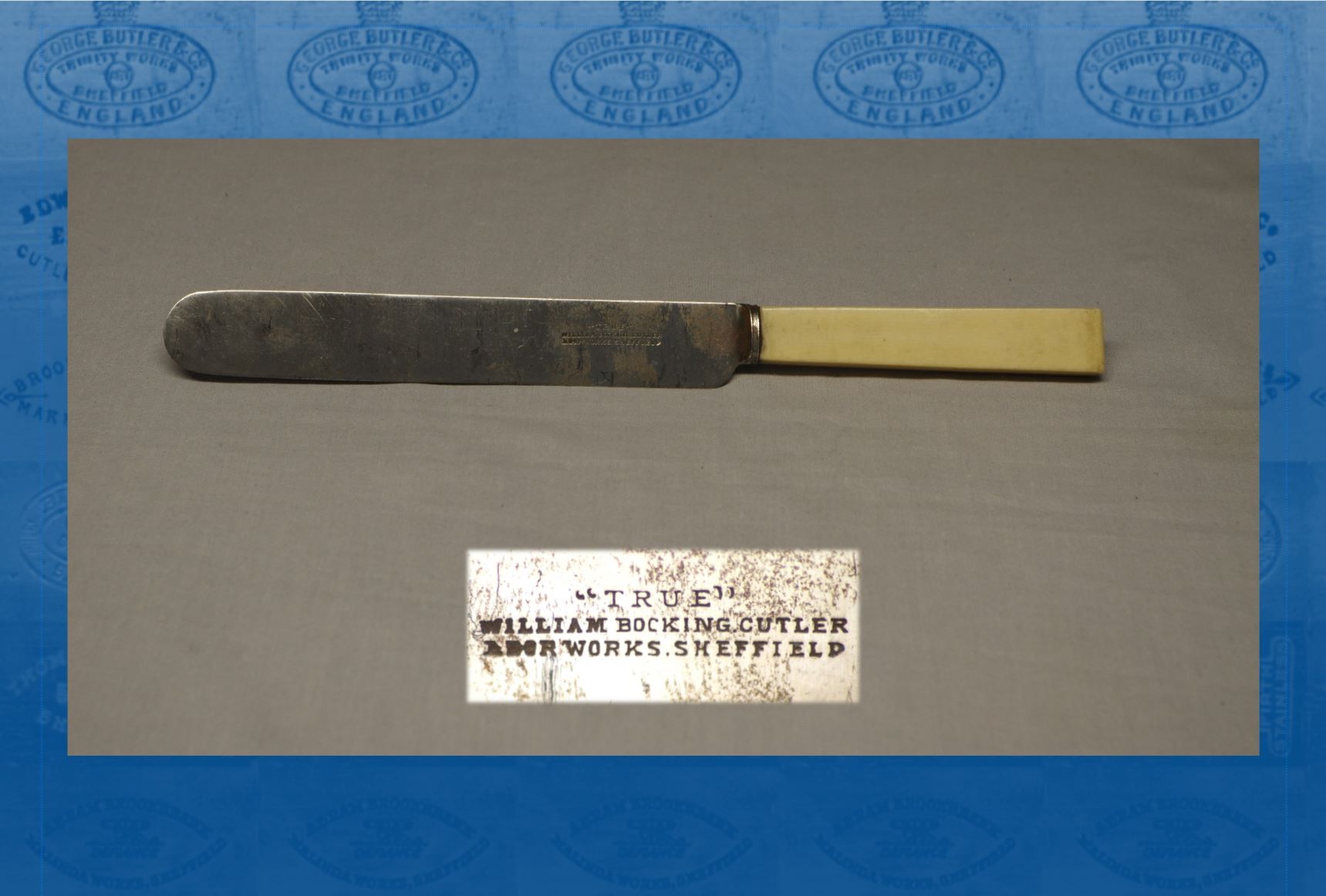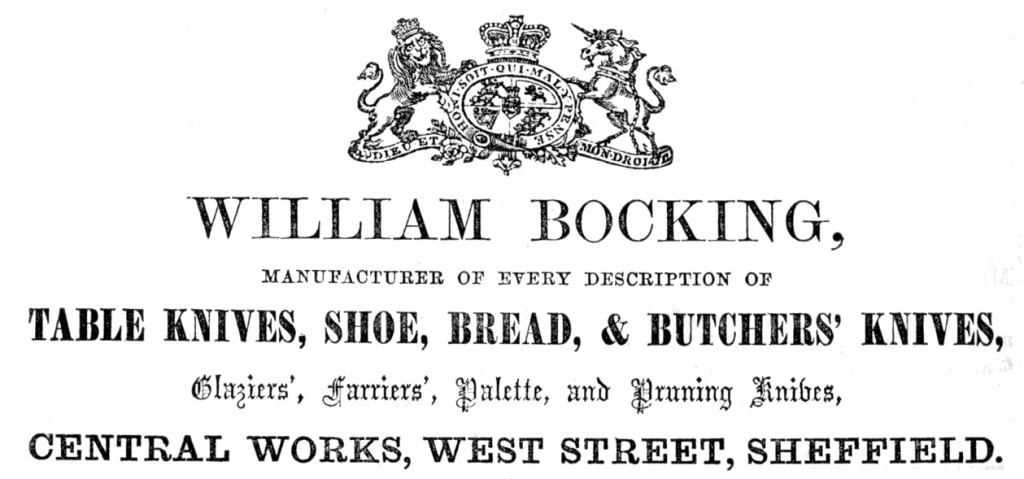 This cutler was the brother of George Bocking. He was born in Crookes, Sheffield, in about 1822, and in 1841 was living there with his parents, Abraham and Hannah. By 1851, William had married Sarah and, while still living in Crookes, was working as a table blade grinder. In 1861, he had moved to Portobello and was a publican, though in the following year advertised as table knife maker at Central Works, West Street. In 1868, he was listed as a manufacturer of butchers’ knives at Cutts Works, Division Street, but he also operated the Rose & Crown in Waingate. In 1876, William retired from cutlery manufacture, but remained a pub landlord. He died suddenly at Mrs Loxley’s, The Original Grindstone, Crookes, on 18 August 1878, aged 56. He was buried in Fulwood, leaving under £1,500.