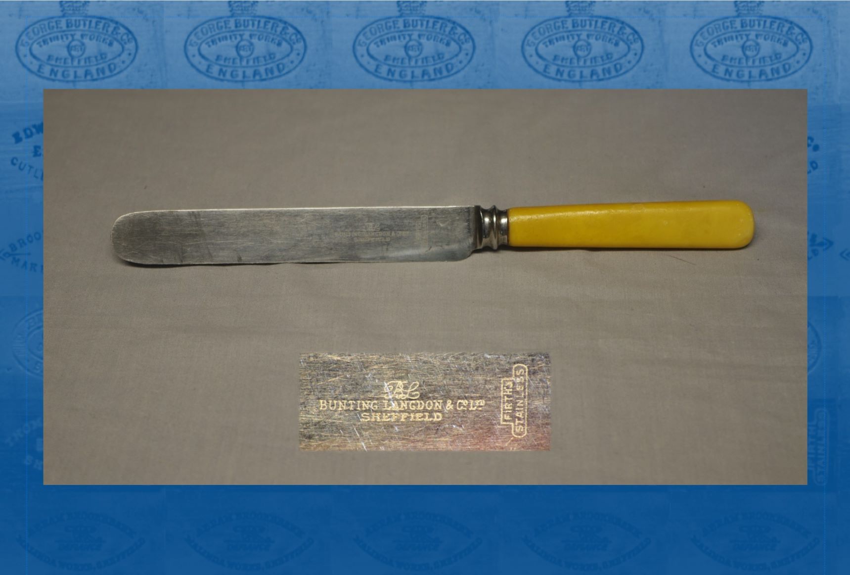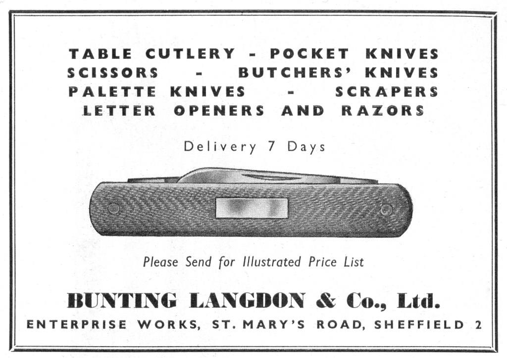 In 1920, Bunting, Langdon & Company Ltd was registered as a private company, with £5,000 capital. Almost the only source on the business is the brief prospectus presented in The Sheffield Daily Telegraph, 27 May 1920. The new company was to take over (i) the cutlery manufacturer and case maker E. P. Saville & Co, at John Street and The Moor, Sheffield; and at Barber’s Lane, Luton; and (ii) cutlery manufacturer Langdon & Ridge, at Button Lane, Sheffield: and at Raymond House, Theobolds Road, London WC.