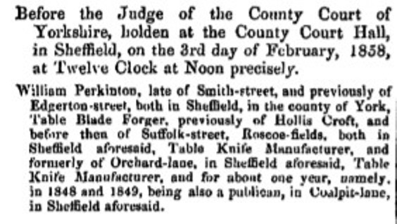 The Perkintons (or Perkingtons, as the name was sometimes spelled) were table knife manufacturers – a trade they often combined with running pubs and beer houses. Joshua Perkinton (1812-1858) and William Perkinton (1816-1876) were brothers, who were the sons of Joshua Perkington (1785-1835) and Elizabeth née Allen (1790-1834). Joshua Perkinton Sen. was listed after 1822 as a victualler at the Red Lion, 54 Holly Street, and a table knife manufacturer. He died of apoplexy on 25 September 1835, aged 50, and was buried in St Paul’s churchyard. Elizabeth had died in the preceding year. (Interestingly, John Perkinton – Holly Street – was buried on 14 March 1836, aged 84, in Portobello churchyard.) In 1841, Joshua Jun. was listed in a directory as table knife manufacturer in Porter Street, with a beer house in Sidney Street (where Joshua and his wife Martha née Hollinsworth lived). He was insolvent in 1842 and henceforth worked as a bone and hoof dealer (and occasional grocer). His last works address was Arundel Street. He died on 23 October 1858, aged 47, and was buried in Christ Church graveyard, Heeley. His son was John Perkington (see Perkington & Deakin).