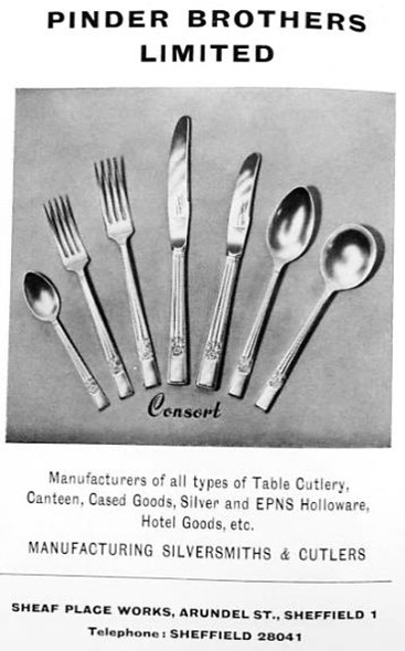 Pinder Bros became a private limited company in 1920 (capitalised at £25,000), with John Thomas as chairman, Charles Edward as managing director, and John William as secretary. The telegraph address was ‘Cruets, Sheffield’. Marks included the word ‘PINRO’. On 20 April 1931, the chairman died suddenly at his home in Glenalmond Road. He left £13,106. On 15 December 1937, Charles Pinder, Chippinghouse Road, also died. He left £8,702. John William Pinder, who had been the traveller in the 1920s, took over, alongside his son, Alan John Pinder (1911-1969). In 1939, a new Sheaf Plate Works was established in Arundel Street, at the junction with Matilda Street. The Second World War saw the company become involved in engineering (a sideline that continued for another twenty years).