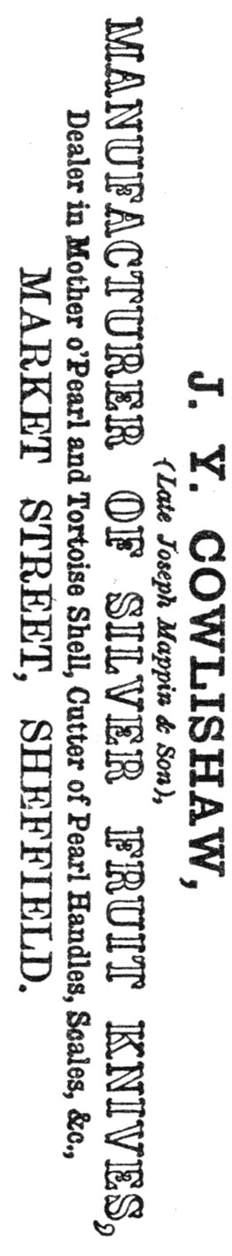Cowlishaw, who was aged 65, had built up an enviable reputation for his silver fruit-knives. He was born in Sheffield on 7 May 1829, the son of John Henry Cowlishaw (1781-1832) and Mary Ann Mappin. His father was a clothier and later a traveller; his mother was the daughter of the cutler Joseph Mappin (see Mappin Bros). After his father’s death, John Cowlishaw was raised by his uncle John Newton Mappin (1800-1883). The latter became a wealthy Sheffield brewer and art collector, but he had first been a designer of pearl handles for his father’s silver fruit-knives. Cowlishaw joined J. N. Mappin as a pearl cutter and dealer in Pepper Alley. By 1851, when he was living with Elizabeth Mappin (his spinster aunt), John was a manufacturer of silver fruit-knives. In about 1854, when he was 24, Cowlishaw launched a business in Norfolk Street as a silver fruit-knife maker and mother-of-pearl cutter. He was also agent for his uncle’s brewery in Rotherham. When Mappin retired, Cowlishaw bought his silver and pearl business and combined it with his own. He moved first to Market Street – his address when his silver mark (JYC) was registered in 1854 – then in 1861 to Baker’s Hill. In 1871, he occupied 67 Arundel Street as ‘successor’ to Heeley & Son, electro-platers and gilders (Sheffield Daily Telegraph, 8 April 1871). However, he continued to run his Sheffield Pearl Works in Baker’s Hill. In silver fruit-knife manufacture, he employed 26 workers; in electro-plate and gilding, he had a staff of 35. In 1881, Cowlishaw sold his Baker’s Hill workshops, so that Arundel Street became his sole address as a pearl cutter and maker of silver fruit-knives. In 1881, the business employed 50 workers and John had brought his sons, John Edward and Frederick, into the firm.