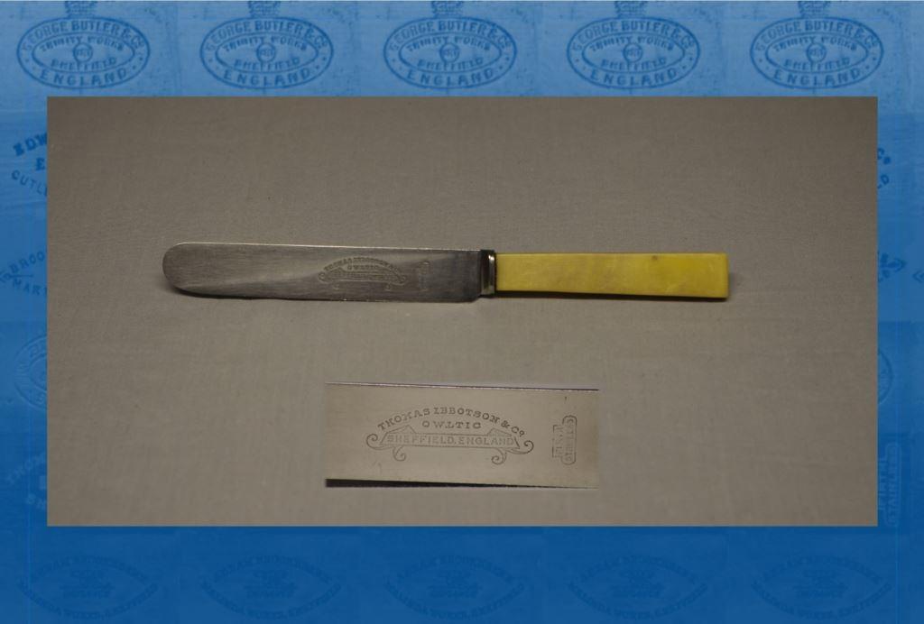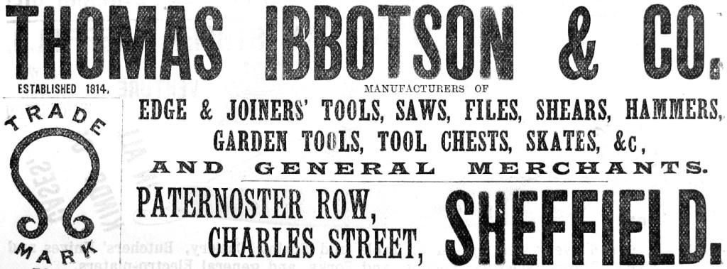 Listed in 1822, this firm (in Charles Street and Paternoster Row) sold edge tools, particularly joiners’ planes. The founder, Thomas Ibbotson (c.1788-1871), was also a merchant and table knife ‘manufacturer’, who made Bowie knives. He retired in 1859 and died at Alma Vale Cottage, Ecclesall, on 21 January 1871, aged 83. He was buried in Ecclesall, leaving under £3,000. His sons – Thomas (c.1813-1883), William (c.1818-1895), and Peter Frith (1834-1905) – became partners in the firm, which by 1871 employed a hundred workers. In 1905, Ibbotson’s assets were bought by William Marples & Sons Ltd. Gee & Holmes later owned the name.