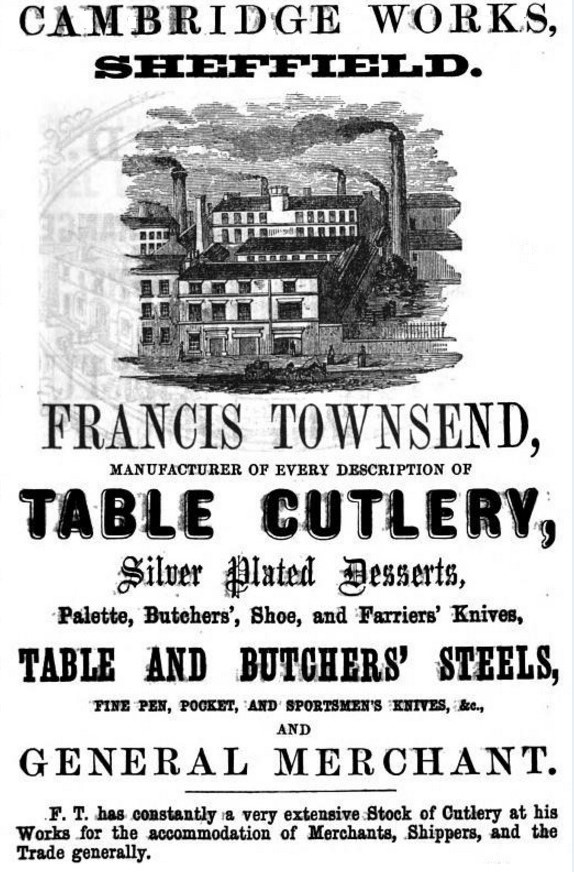 In 1845, Francis Townsend Jun. advertised at Solly Street as a manufacturer of ‘every description’ of table cutlery, palette, butchers’, shoe knives, and table and butchers’ steels. He employed a dozen men in 1851. His father died at Broad Lane on 4 August 1853. Francis Townsend’s factory in Solly Street (Cambridge Works) was described as ‘extensive’ (Sheffield Independent, 24 August 1864). Townsend’s full-page advertisement in Kelly’s Post Office London Directory (1862) illustrated two factory entrances: one on Edward Street, the other on Solly Street. In reality, Townsend’s workforce was only about twenty, housed in a tenement-type factory, alongside other tradesmen. The multi-storey layout of grinding hulls and workshops, perched on the side of a hill, was cramped and a fire risk. Serious fires occurred in 1872, 1875, and 1906 (Yorkshire Telegraph & Star, 8 September 1906).