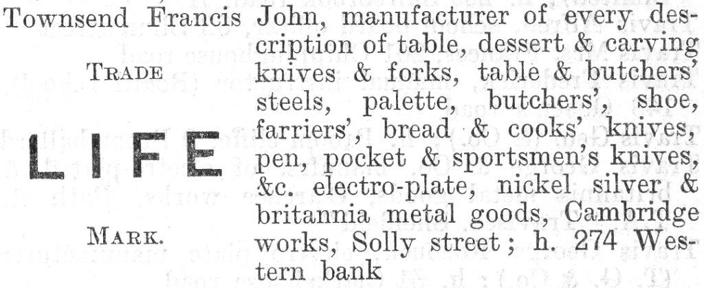 The firm had ceased trading by 1917, when there was a modest auction of hand-forged table and dessert blades, handles, ivory cutting machines, and glazers (Sheffield Daily Telegraph, 20 November 1917). Francis J. Townsend died on 19 December 1917 at Western Bank, leaving £1,567. His press obituary requested: ‘Australian papers please copy’. He was buried at Burngreave, though other members of the family occupy a grave at St Nicholas Church, Bradfield. Townsend’s trade mark was ‘LIFE’: once associated with Samuel Warburton and George Latham); and later with James Farquharson & Sons.