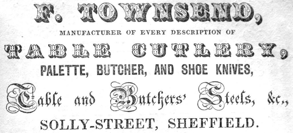 Francis Townsend (1793-1853) was one of three brothers – the others were Joseph (1797-1843) and John (1800-1838) – who were baptised at Stannington (Presbyterian) Chapel. They were the sons of Joseph (c.1771-1847), a grinder, and his wife, Elizabeth (c.1766-1815). Between about 1828 and 1832, John partnered Robert Hides as a table knife and razor manufacturer at Hollis Croft. (Interestingly, James Townsend had appeared in directories in 1774 and 1787 as spring knife cutler at Hollis Croft) Until his death on 24 May 1838, aged 38, John was listed as a table knife manufacturer at the ‘head of Garden Street’. Joseph was in Garden Street, too, as a table blade grinder. Francis was landlord at The Golden Ball, Broad Lane (though he also worked as a table knife manufacturer). His son, Francis Jun. (1816-1891), became a table knife manufacturer at Hollis Croft.