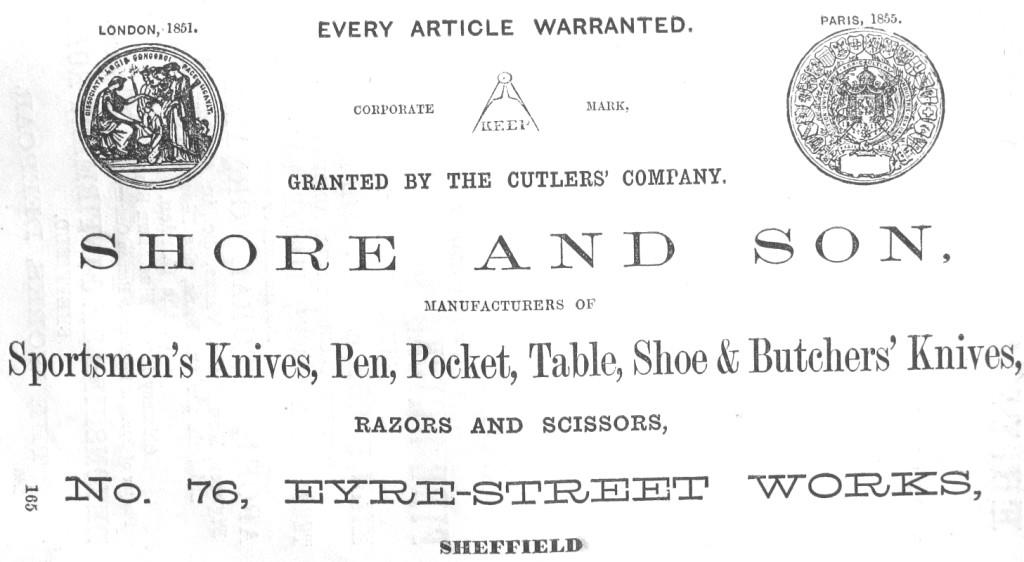 A trade advertisement in 1860 described Shore & Son as a manufacturer of sportsman’s knives, pen, pocket, table, shoe and butchers’ knives, razors and scissors. The firm was based in Eyre Street Works. The trade mark was a set of dividers (picture) above the word ‘KEEP’ (apparently later acquired by Joseph Fenton). Exhibition medallions for London (1851) and Paris (1855) grace the advertisement, but I have not found any evidence that this firm exhibited at either. In 1862, Shore & Son was still listed, with George C. Shore and Gordon Shore (his son) residing at Sharrow View. Apparently, George retired and moved with his son to Southwark, London, where George Gordon became a ‘collector’. The father died in Fulham in 1883; the son at Poole Park, Fulham, on 2 June 1890, aged 52.