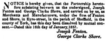 This business was launched by George Clarke Shore, who was born in Gainsborough, Lincolnshire, in about 1805. He was listed in Sheffield in 1841 as a commercial traveller. By 1845, he was described as a cutlery merchant and manufacturer, Broom Parade. By then, he had joined Joseph Fenton to establish Fenton & Shore – the forerunner of Joseph Fenton & Sons. In 1857, the partnership with Fenton was dissolved. Shore & Bagshaw then appeared (with Robert Bagshaw), but this was dissolved in 1859. Shore decided to organise his own business (perhaps because his sons had come of age).