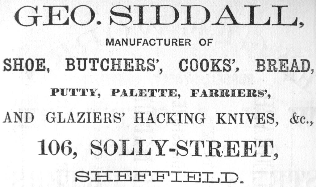 George Siddall’s early life is uncertain (his name was common enough to confuse his background in the parish registers). However, at the time of the Census (1841), he was living in Corn Hill and working as a table knife cutler. He appeared in a Sheffield directory in 1845 as a shopkeeper in Allen Street. In 1850, he was trading in table and butchers’ knives in Edward Street, but he continued to operate his shop in Allen Street. By 1859, Siddall was selling a wide range of trade knives (for butchers, cooks, painters, furriers, and glaziers) from Solly Street and Brocco Street. He seems to have relinquished his shop keeping business by the late 1860s and decided to concentrate on cutlery. In 1871, when he was aged 48, he employed 17 workers.