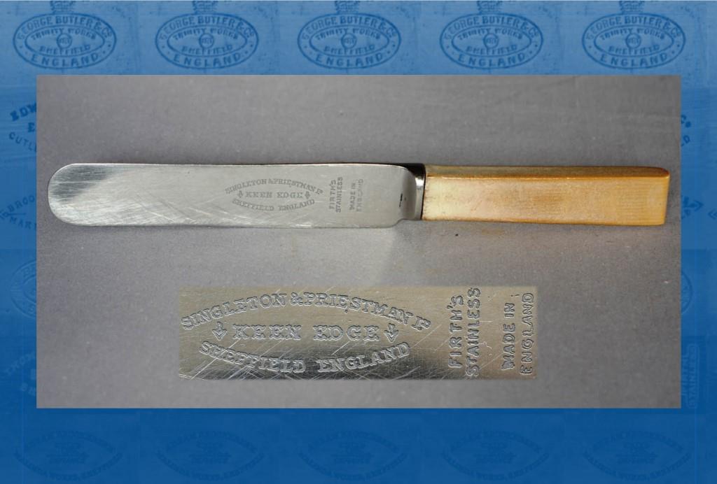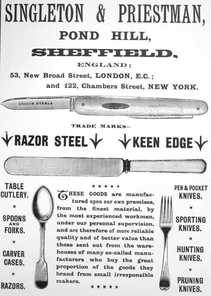 Singleton’s partner was Edmund Priestman (1852-1939), who had joined him in 1875. Priestman had been born in Sutton, Yorkshire, the son of an owner of land and houses. He took over the business and it became Singleton & Priestman. In 1896, the company registered a silver mark from Pond Street, where it was listed as a manufacturer of silver and electro-plate goods and cutlery. The firm had a London office at New Broad Street and an agent in New York. By 1910, its address was Arundel Lane. In 1922, the firm became a private limited company (capital £5,000), with Edmund and his daughter, Barbara, as directors, alongside W. T. Montford and G. W. Womersley. In 1925, it was in Sidney Street as a manufacturer of pocket, table, tea, and pruning knives and specialist in gift and advertising knives. Its trade mark was a variation on the arrowhead device, with the words ‘RAZOR STEEL’. Singleton & Priestman was based in Carver Street in 1931 and was last listed in 1936. Edmund Priestman died at Buxton on 17 July 1939, aged 87. He was buried at Ecclesall.