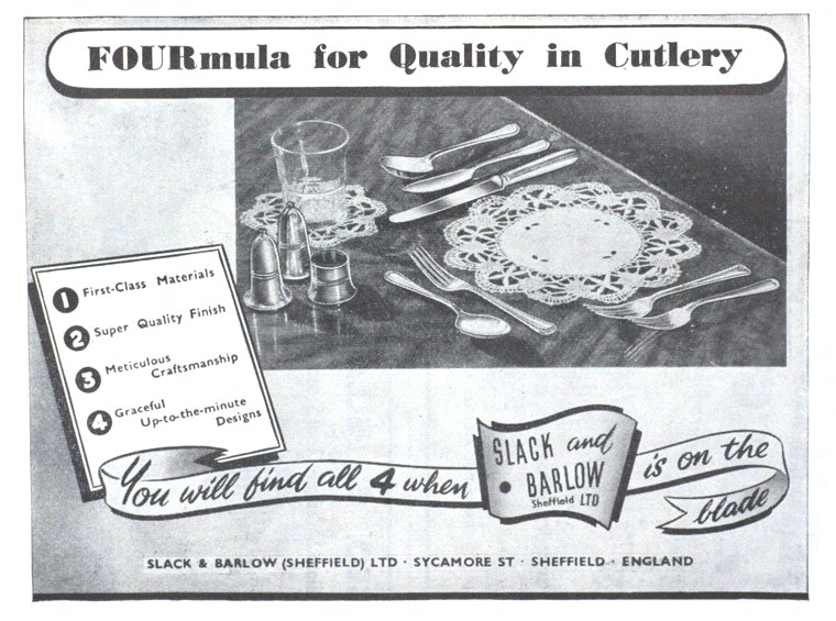 Frank Barlow was born on 23 August 1912. By 1939, he was working in a cutlery warehouse. Slack & Barlow (incorporated in 1947) was based at Sycamore Street and Eyre Lane, where directors Frank Barlow and M. Barlow (probably Frank’s wife, Mary) produced flatware, table and pocket knives, and cases of cutlery for the mass market (marked ‘BARSLAC’). In 1958, they moved to the new Silverpride Works in Matilda Street, which traded into the 1980s. Herbert Housley recalled: ‘we traded between each other buying each other’s specialities. During the many years that I knew the owner, Frank Barlow … I never met a Slack, nor did he ever mention the name. I understand that Frank had been a manager in the spoon and fork department of Mappin & Webb before going into business on his own. It was always a thriving and prosperous company with a terrific trade in Australia where their inexpensive Silverpride EPNS, in attractive gift boxes, became best sellers. After leaving high school his son, John, joined the company’ (communication to author). The firm was dissolved in 1994.