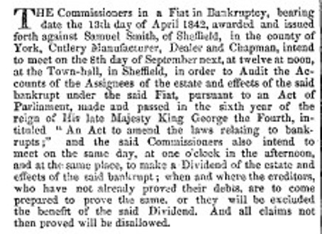 Certainly, Smith became bankrupt. In 1842, he auctioned his stock, tools, and household furniture. His stock included examples of the celebrated ‘Saxe Gotha’ razors with gold mountings and shields (Sheffield Independent, 7 May 1842). In 1842, the Company of Cutlers gave £5 distress money to Samuel Smith, who died on 20 July 1843, aged 61. St Peter’s burial register described him as a ‘razor manufacturer’, residing in Glossop Road (Portland Place). In that year, the Company of Cutlers helped his widow gain admission to Shrewsbury Hospital in Sheffield.
