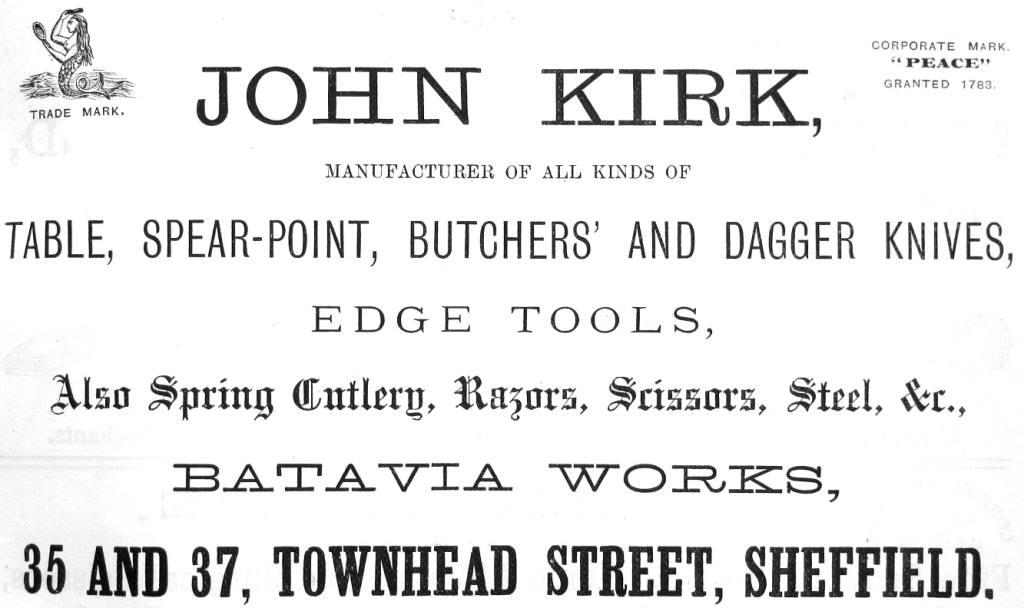 Another fire hit Kirk’s factory in 1881, when the local press described the layout of Batavia Works (Sheffield Independent, 15 December 1881). The offices and warehouse faced Townhead Street, with two blocks of three-storied workshops at the rear, and connected by a wooden box to protect the [driving] band. The workshops were used for the manufacture of butcher and table knives. India and South America were apparently the firm’s major export markets. Kirk’s trade marks were a mermaid (picture) and the word ‘PEACE’, granted 1783. (The mermaid mark was later used by Edwin Herriott) In 1878, Kirk had been fined £20 for infringing the horse’s head mark of George Deakin. In 1887 he was sued by John Copley & Sons, because (it was alleged) Kirk’s use of a ‘KK’ mark imitated Copley’s ‘XX’. A report of the court case filled three columns in the local newspaper. John Kirk denied any attempt to deceive. He claimed only a limited role in the business as sole partner: ‘I have very little interest in it now. I worked for 60 years and thought that I might take a little ease now’ (Sheffield Independent, 20 December 1887). The magistrate gave him the benefit of the doubt and the case was dismissed.