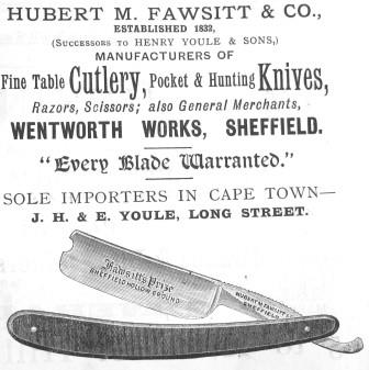 An advertisement (1892) provided an establishment date of 1832, though this probably refers to the company that Fawsitt took over – Henry Youle. Fawsitt’s was a merchant, which sold fine table cutlery, pocket and hunting knives, razors, and scissors at Wentworth Works, Burgess Street. South Africa was evidently one of its export markets. The owner was apparently Hubert Morland Fawsitt, who had been born in Scotland. In 1890, he sold the business to Colquhoun & Cadman, Douglas Works, 113 Arundel Street. In the Sheffield directory (1905), Colquhoun & Cadman had adopted the ‘Fawsitt’ name in a characteristic scroll trade mark with the words ‘H.M. FAWSITT & CO PRIZE’. In 1907, Fawsitt’s name passed to Ellin at Sylvester Works, after the latter had absorbed Colquhoun & Cadman. The ‘Fawsitt’ name was listed in directories until about 1917. Hubert M. Fawsitt apparently became an insurance manager. He died at Southsea on 4 September 1907, aged 50, leaving £71.