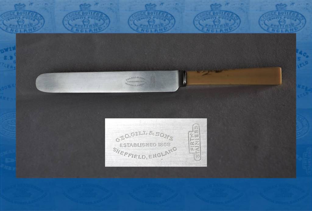 In 1930, George Gill & Sons (Sheffield) Ltd was incorporated as a table and pocket cutlery manufacturer. Capital was £1,000 and the directors were George Russell Gill (1890-1959) – George Alfred’s son – and George Henry Hastings (1887-?). In 1935, they registered an ‘Improvement’ in knives, by designing an edge with fine V-shaped grooves (or flutes).