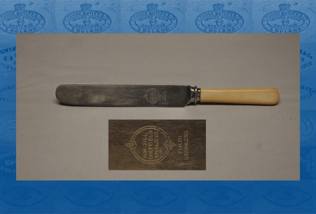 In 1919, his son, George William Gill, was listed as a cutlery manufacturer at Central Works, 100 West Street. In 1920, he registered G. W. Gill Ltd as a private limited company, with £6,000 capital. His accountant, Percy Toothill, was listed as a subscriber. In 1921, Gill (who claimed ‘35 Years’ Reputation’) advertised a game pocket knife of his own design. He also introduced an electrician’s knife, with a hand-forged blade and two spanners. Razors, stainless table cutlery, and electro-plated goods were also advertised. Presumably, most of these products would have been factored. Gill relied on borrowing to launch his business, but when trade turned sour the debenture holders ordered the sale of the business. It was offered as a ‘going concern’ and ‘well-equipped business’ at West Street, Rockingham Street, and Penton Street.