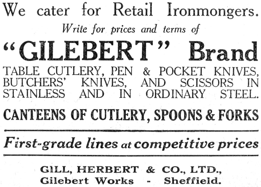 This cutlery, tool, and surgical instrument manufacturer was registered in 1920 at 13 Arundel Lane, with £7,000 capital (Sheffield Daily Telegraph, 21 September 1920). The directors were Percy Turner, 171 Hunter House Road; and Francis Botham, 225 Wincobank Avenue (who was also secretary). The firm manufactured (or probably factored) pen and pocket knives, butchers’ knives, table knives, scissors, and canteens of cutlery, with spoons and forks. These goods were offered in stainless steel or ordinary carbon steel. ‘We cater for Retail Ironmongers’, announced one advertisement. The brand name was ‘GILEBERT’. The origin of the company name is difficult to ascertain: so, too, the background of Turner and Botham. Both partners may have been born outside Sheffield. In the early 1920s, Botham was involved with J. H. Bramwell & Co Ltd, a Sheffield file and butchers’ steels maker.