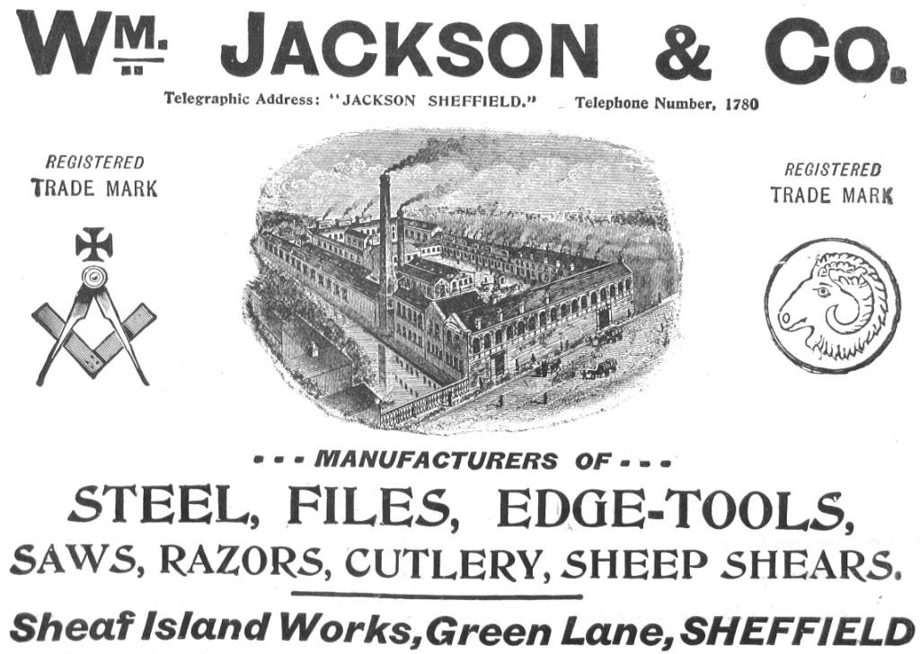 William Frederick Jackson became the senior partner. In 1905, however, W. F. Jackson and his younger brother Arthur Moore Brightmore Jackson sold the business. Sheaf Island Works was taken over by Joseph Rodgers & Sons. The address of ‘Sheaf Island Works’ shifted to Green Lane, Neepsend, and by the early 1920s the Jackson name had been taken by the saw and tool maker, Alfred Beckett & Co. Jackson’s was still listed in the 1960s. William F. Jackson himself lived at Broadstorth in Dore. He died on 11 July 1944, aged 95, leaving £38,273. His wife, Emilie Marian, survived him until 1963, when she died aged 100. Their grave is at Christ Church in Dore.