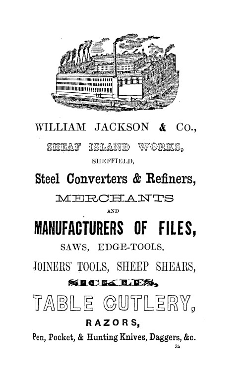 In 1853, Jackson moved to Sheaf Island Works, Pond Hill. This factory once stood on the site of the present bus station (close to the Midland railway station). It was a large works that had (if the engravings are accurate) converting furnaces and crucible melting shops. It became home to a variety of individuals and trades, so Jackson did not own the whole factory. Sheaf Island Works may have been built as a response to the burgeoning American trade. In 1851, Wm. Jackson & Co had a New York office in Pearl Street (with C. Padley) and another in Commerce Street, Philadelphia. In 1853, Jackson exhibited steel, saws, and cutlery at the New York Exhibition.