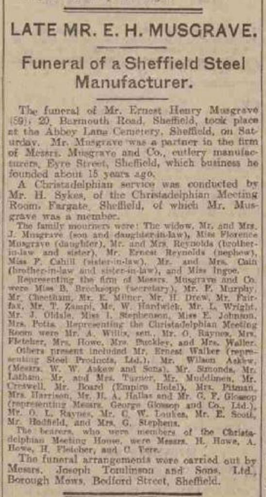 The founder was Ernest Henry Musgrave (1872-1932), who had been born in Liverpool, one of seven children of Dyer Stead Musgrave and Elizabeth (nee Ingoe). The family moved to Sheffield around 1901 and Ernest Henry initially worked as the manager of Tate's Furniture Store at 88 Pinstone Street. He set up Musgrave & Co Sheffield around 1923.