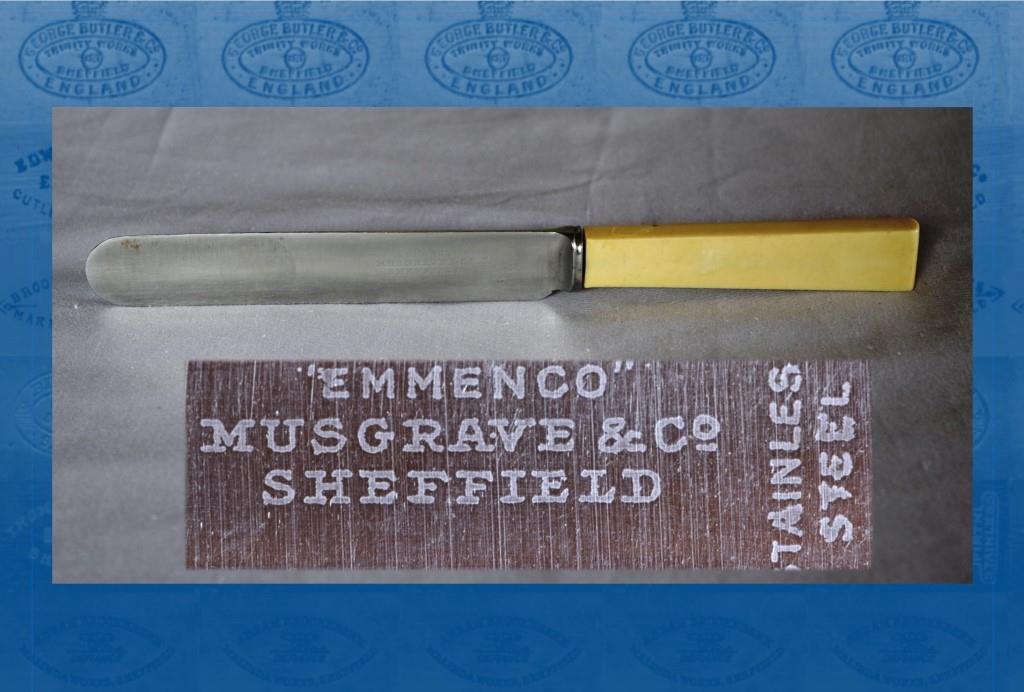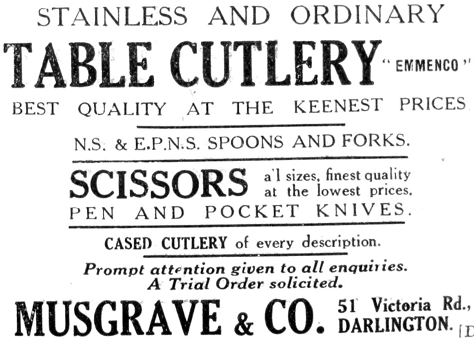 Musgrave & Company operated in the 1920s and 1930s in Eyre Street (No. 48 ‘back of’). However, in the late 1920s it also had a Charles Street address and an agent in Darlington. It marketed ‘Firth Stainless’ table cutlery (sometimes sold in fancy canteens) with the trade mark ‘SILVER SEAL’.