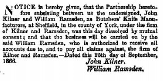 Short-lived with an obscure history, this firm apparently began as Kilner & Ramsden. It advertised in 1865. ‘Kilner’ may have been the John Kilner, who was later involved with Kilner Bros. William Ramsden was the other partner. Ramsden and Francis Bradshaw then formed Ramsden, Bradshaw & Co, butchers’ knife manufacturer in Cambridge Street, but this partnership was dissolved in February 1867. William Ramsden & Co advertised in the Sheffield directory in 1868. It was based at Albion Works, Cambridge Street, and manufactured (or factored) table cutlery, spear, butcher, cook, bread, and shoe knives. In the directory, a residential address is also given for the business at 37 Summer Street (off Mushroom Lane). However, by then William Ramsden, ‘cutler’ of 39 Summer Street, had died on 20 August 1867, aged only 27. He was buried in the General Cemetery.