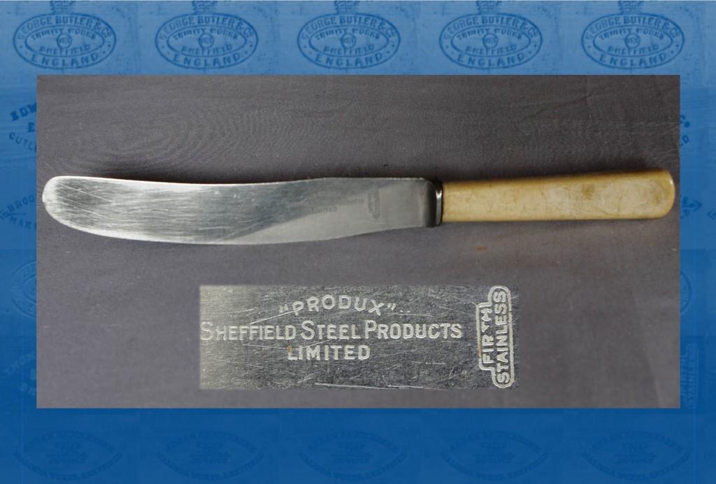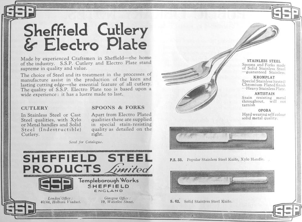 Advertisements in the early 1930s (published in Quality, the journal of the Sheffield Chamber of Commerce) featured ‘Firth Stainless’ table knives (either stainless throughout or with xylonite handles) and spoons and forks. The latter were made in either stainless steel, or chromium plated with a ‘KROMPLAT’ finish. Spoons and forks were made of ‘ANTISTAIN’ metal throughout, or in a material described as ‘self colour’ hard-wearing solid metal (‘OPOBA’). These plated goods were probably produced by the SSP subsidiary, Eagle Plate Co Ltd. During the Second World War, SSP made solid handle knives and clasp knives, but in the 1950s sank into obscurity. It had ceased trading by the 1960s and was would up in 1972. Its trade marks included ‘SSP’, the word ‘DURALITE’ on stainless cutlery (registered in 1931), ‘The REAPER’ (words and picture) on safety razors, and the word ‘PRODUX’ on stainless table knives.