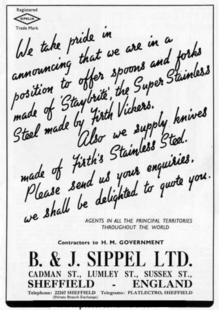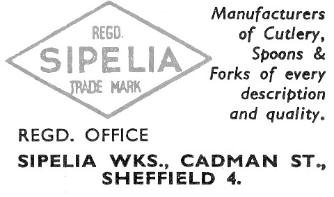 The Collins attempted to recapture Sippel’s initial dynamism. But it was never listed in Sheffield directories in the cutlery section. That was because it was a spoon and fork manufacturer, which relied on other Sheffield cutlers for its knives. (According to one undocumented source, G. W. Thornton was one supplier.) The firm produced flatware in volume, but remained a somewhat anonymous manufacturer. It eschewed the publicity campaigns favoured by the likes of Arthur Price Ltd and Viners. It had only a couple of trade marks: ‘SIPELIA’ on cutlery (registered in 1934) and ‘DURA-CROMA’, used on chromium plate and cutlery. The firm’s occasional advertisements were dull and uninspiring.