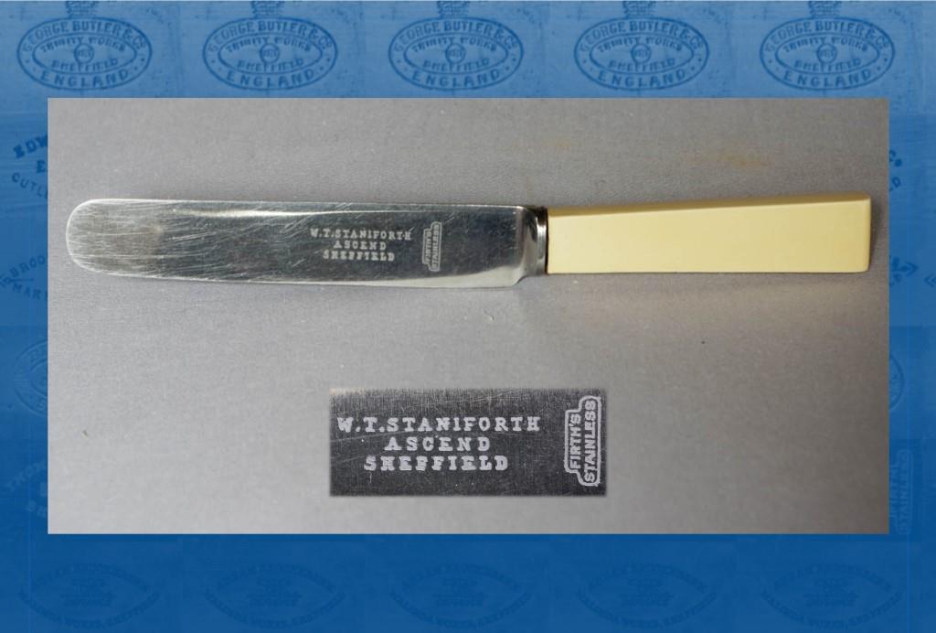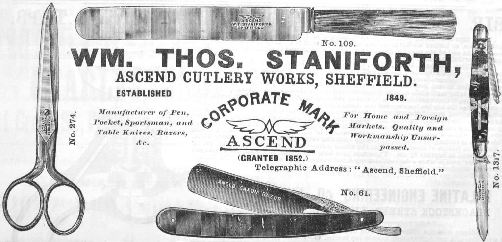 Staniforths had been cutlers since at least the sixteenth century. This Staniforth business was apparently founded in 1849. William Thomas Staniforth (c.1820-1890) was listed as a spring-knife maker in Norfolk Street in 1852. He was involved in the activities of John Rodgers & Sons, which attracted a notable legal action from Joseph Rodgers & Sons. In 1853, Staniforth was bankrupt. Instead of paying his creditors, he sold his stock of cutlery cheaply and fled to Liverpool. With four cases of cutlery (worth £400), he intended to sail for America. However, he was caught and brought back to Sheffield (Sheffield Independent, 30 June 1855, 26 January 1856). Staniforth relaunched his business at various addresses: Brown Street (1861); Baker’s Hill (1871), where he employed ten men and two boys; and Eldon Works, Eldon Street (1876). In 1881, Staniforth was living with his family in Eldon Street and employing 20 men. In about 1882, the business relocated to Ascend Cutlery Works in Arundel Lane (Industries of Sheffield, 1888). William Thomas Staniforth (the founder’s son) increasingly took control of the firm. It offered a full range of cutlery, but particularly high-quality pen, pocket, and sportsman’s knives (such as a novel cartridge knife depicted here). Its first corporate mark – open wings above the word ‘ASCEND’ – was granted in 1852. Another trade mark was registered in 1884: it featured a two-blade pen-knife, with the words ‘VALUE RECEIVED’.