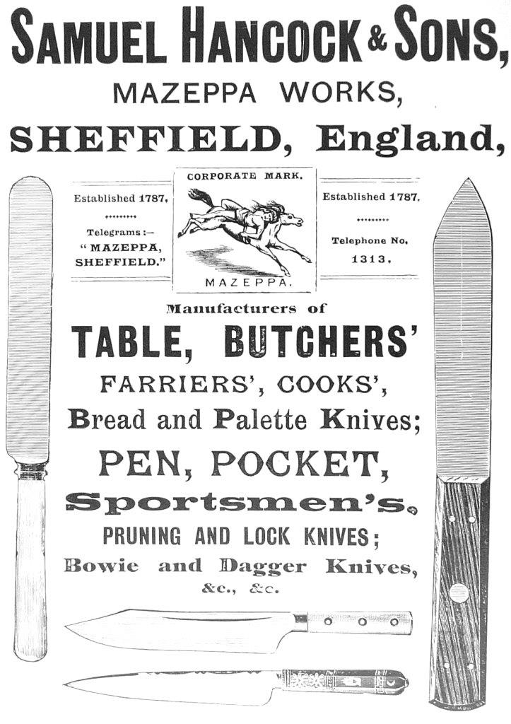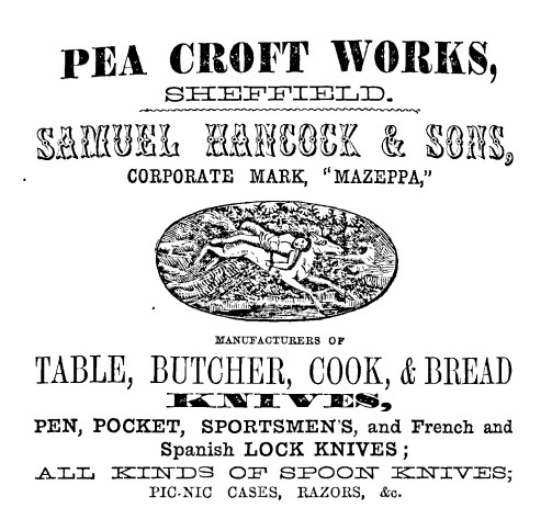 This firm had one of the most striking of nineteenth-century trade marks – ‘MAZEPPA. This was a reference to Ivan Mazeppa, a historical Cossack figure in Ukraine, who had been bound naked to a horse’s back as a punishment for adultery. Advertisements stated that the mark was first used in 1787. The business was started by Samuel Hancock (c.1795-1854), who in the 1841 census was a cutlery manufacturer in Pea Croft. In the 1820s and 1830s, he had combined pen knife and razor manufacture, with running a grocery shop. Samuel was probably one of the brothers (the other was Thomas Hancock), who operated Hancock Bros, cutlery manufacturers, Pea Croft. This was dissolved in 1842. By 1849, Samuel Hancock had become a pen and pocket knife manufacturer at Pea Croft Works. He was granted the Mazeppa mark in that year. In 1852, Samuel Hancock & Son was located at 45 Pea Croft, with Samuel residing in Northumberland Road and his son, Jonathan Smith Hancock (1820-1876), living in Broomhill.
