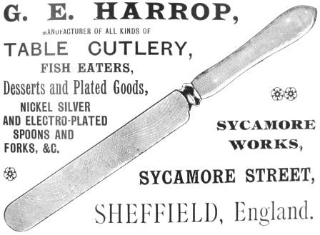 George Edward Harrop (1869-1942) was born in Sheffield, the eldest son of Aaron Harrop and his wife, Elizabeth. He apparently joined his father’s table cutlery business, but after that hit financial problems George launched his own firm. He advertised in the Foreign Buyers’ Catalogue (1895) as a manufacturer (or merchant) of table cutlery, fish eaters, dessert and plated knives, Sycamore Works, Sycamore Street. Later addresses included Rockingham Street and Holly Street. In 1899, George Edward married at Great Longstone Hannah Rebecca née Sellars, the daughter of a miner. However, Hannah died in the following year, aged 35, and was buried at Great Longstone. After 1905, when he was listed at Holly Street and Norfolk Market Hall, George Edward disappeared from directories. In 1911, he was living at Great Longstone, Derbyshire, where he was residing with his mother-in-law. His occupation was stated as table knife manufacturer, on his own account. In 1939, he was living at Bakewell and had retired. George Edward Harrop was buried at Great Longstone on 20 May 1942, aged 72.